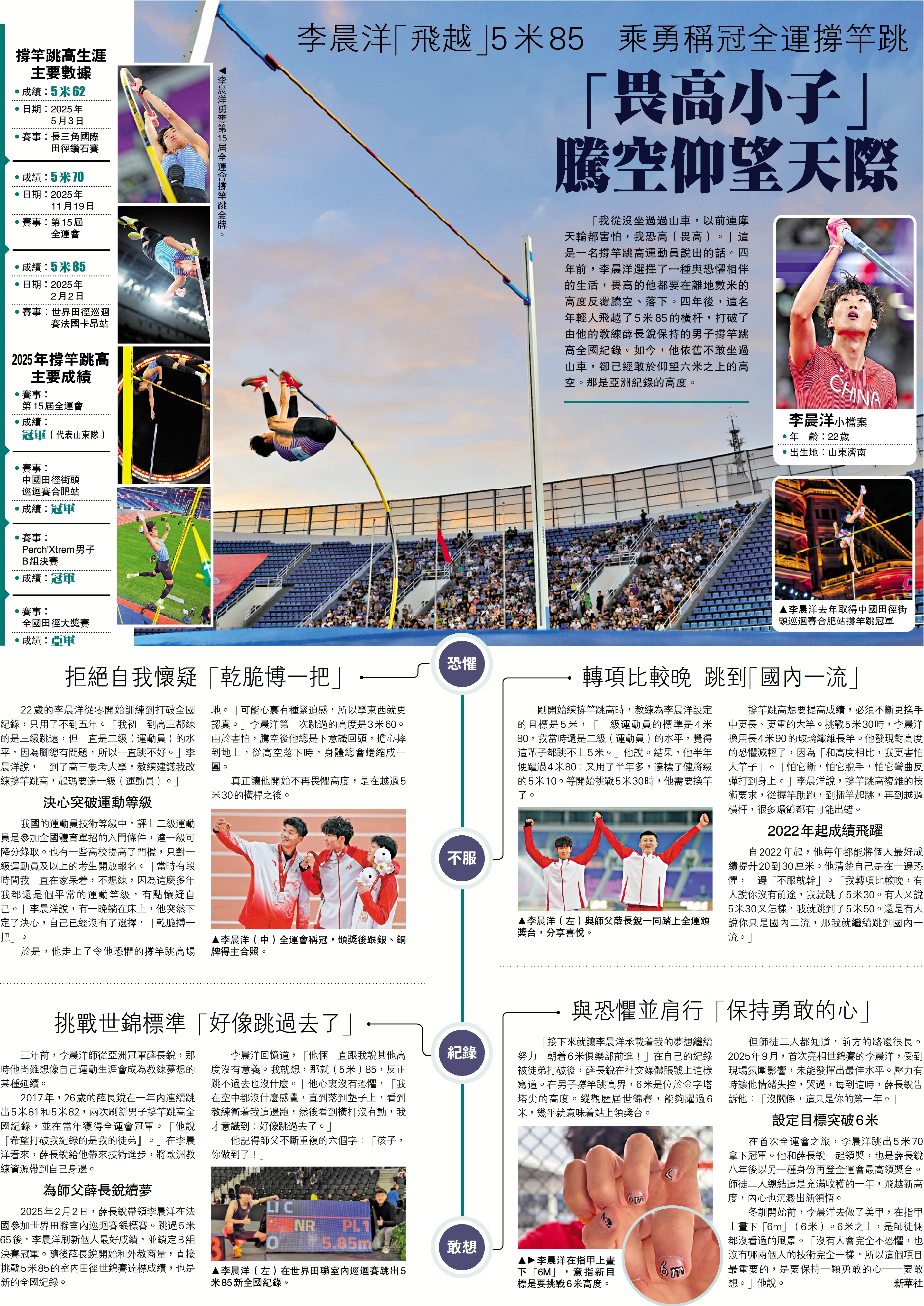 自2022年起,他每年都能將個人最好成績提升20到30厘米。他清楚自己是在一邊恐懼,一邊「不服就幹」。「我轉項比較晚,有人說你沒有前途,我就跳了5米30。有人又說5米30又怎樣,我就跳到了5米50。還是有人說你只是國內二流,那我就繼續跳到國內一流。」