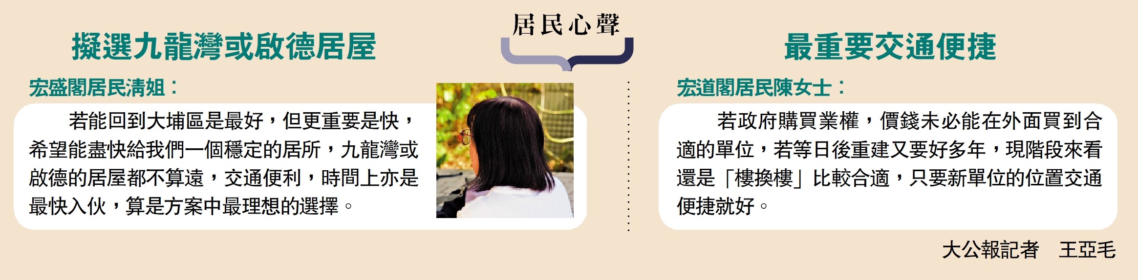 若能回到大埔區是最好,但更重要是快,希望能盡快給我們一個穩定的居所,九龍灣或啟德的居屋都不算遠,交通便利,時間上亦是最快入伙,算是方案中最理想的選擇。