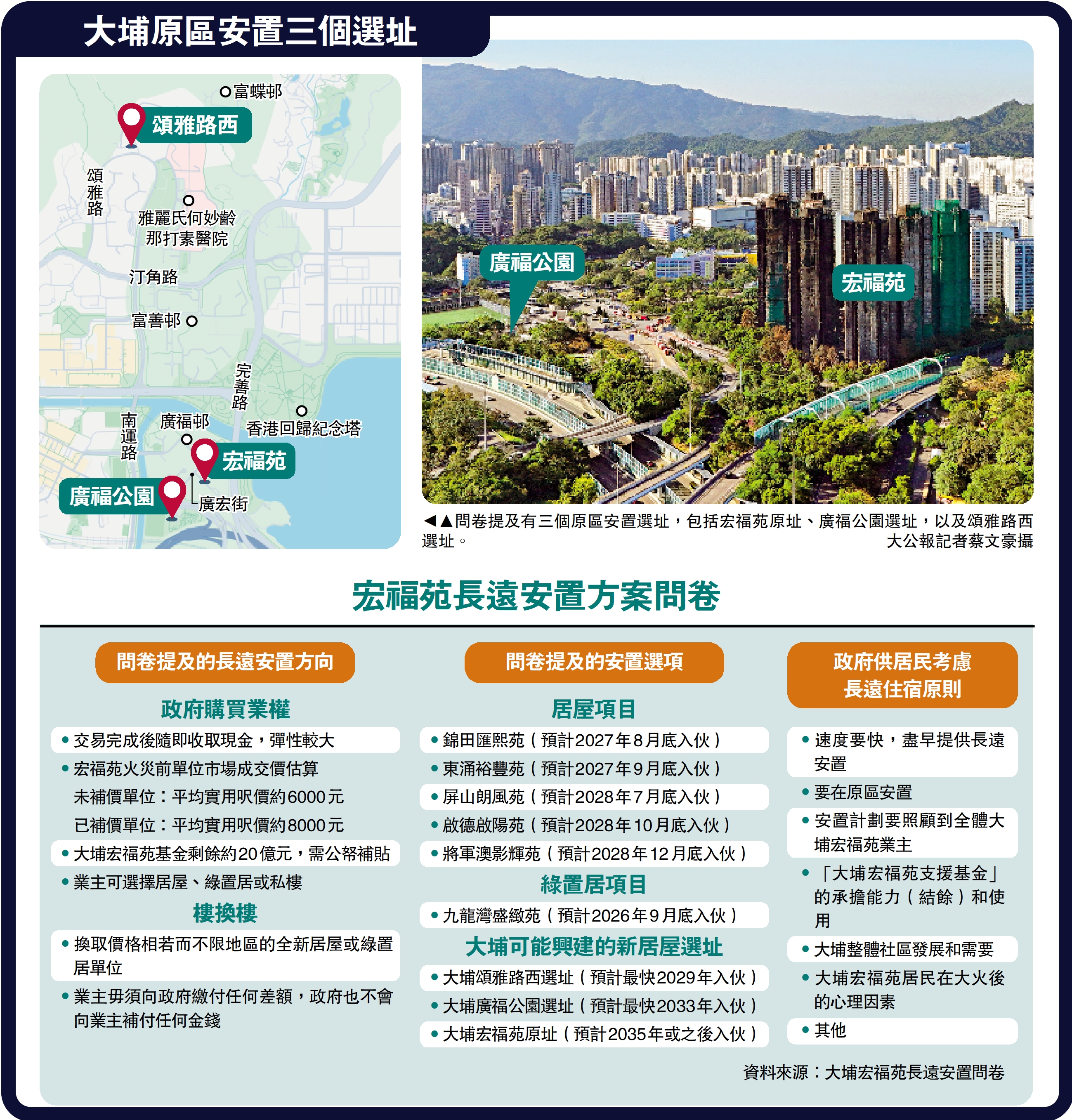 在大埔原區重建方面,問卷提出有可能興建的新居屋單位地點,包括大埔頌雅路西、廣福公園、宏福苑原址,當中頌雅路西選址預計最快2029年入伙,但宏福苑原址則預計2035年或之後才能入伙。