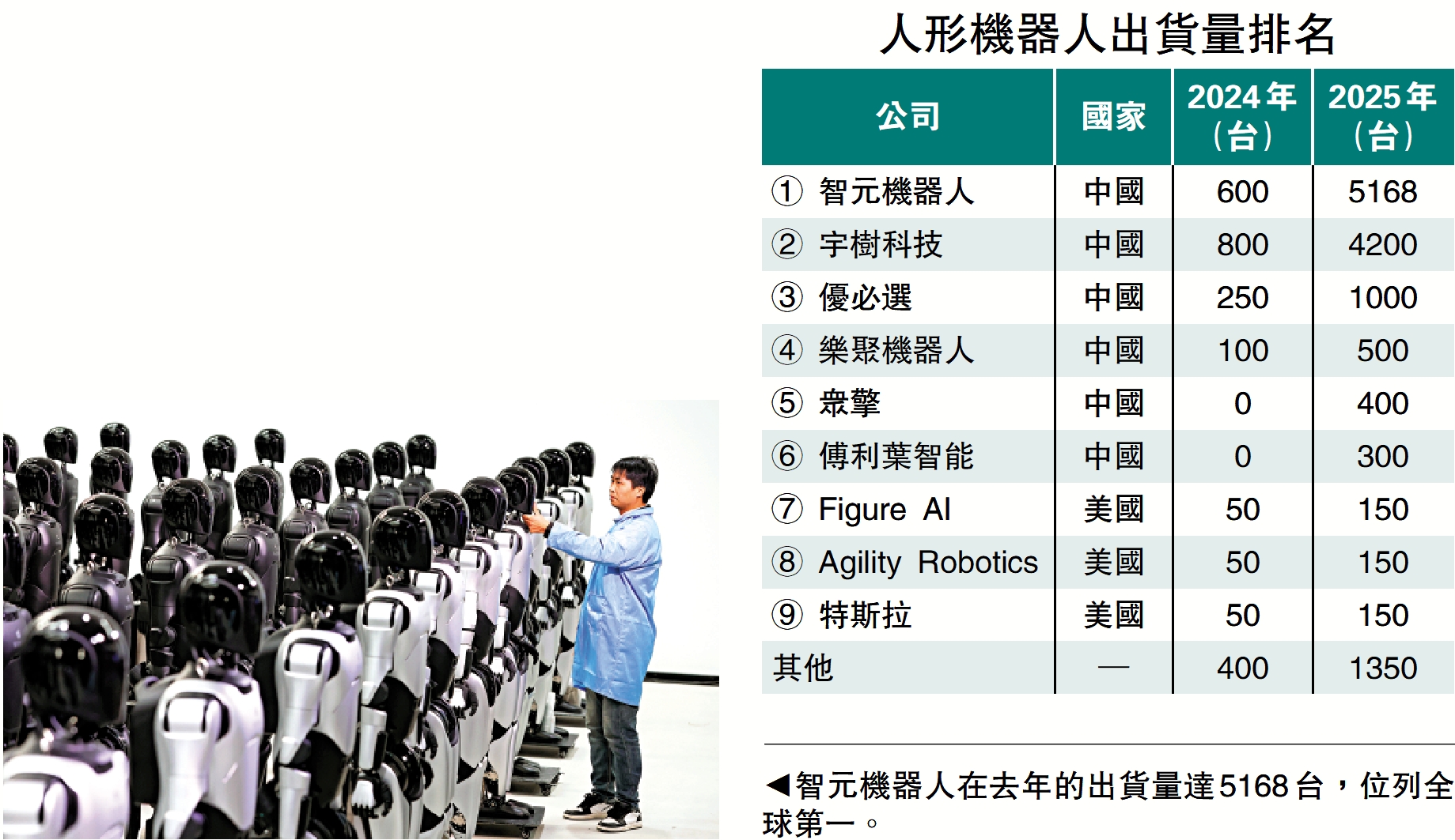 【大公報訊】市場研究機構Omdia日前發布的《通用具身機器人市場雷達》報告指出,2025年全球人形機器人市場邁入快速增長階段,全年出貨量料達1.3萬台。中國廠商整體領跑全球。其中,智元機器人(AGIBOT)出貨量達5168台,佔全球出貨量的39%,位列全球第一。
