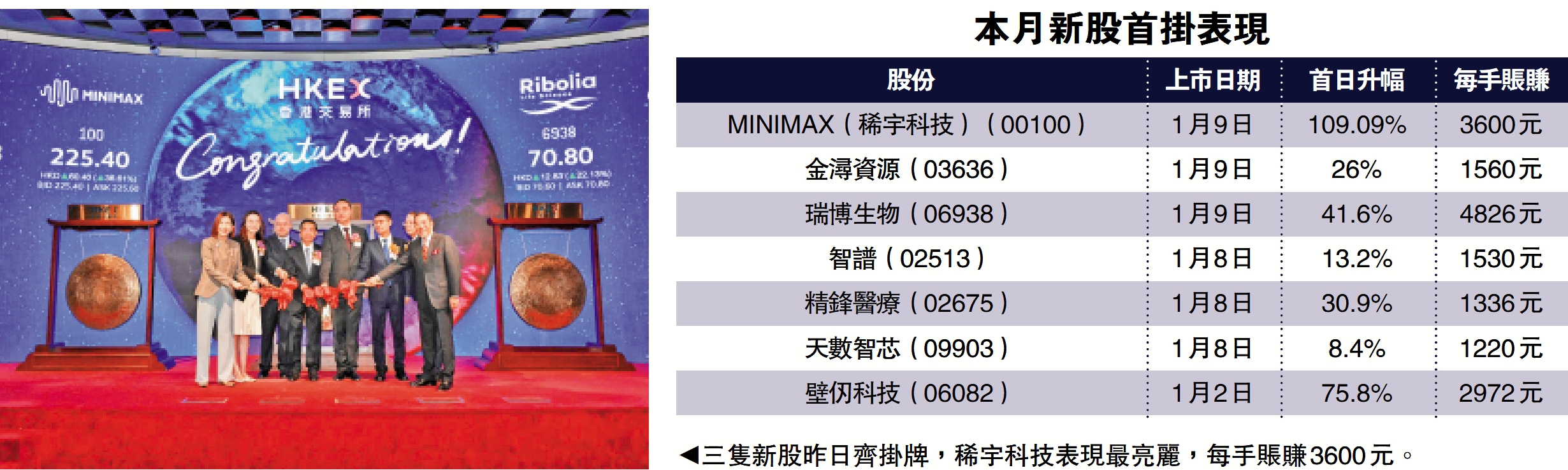 【大公報訊】新股市場持續暢旺,昨日三隻新股掛牌齊升,其中以「AI六小虎」之一的MINIMAX(稀宇科技)(00100)表現最亮麗,曾高見351.8元,收市報345元,較招股價高出1.09倍,總市值超過千億元,一手20股,不計手續費,賬面賺3600元,以股價升幅百分比計,為三股中最高,也是今年以來新股首日表現最佳股份。同日上市的瑞博生物(06938)較招股價升41.6%,收報82.1元,一手200股,不計手續費,賬面賺4826元;金潯資源(03636)則升26%,收報37.8元,一手200股,不計手續費,賺1560元。