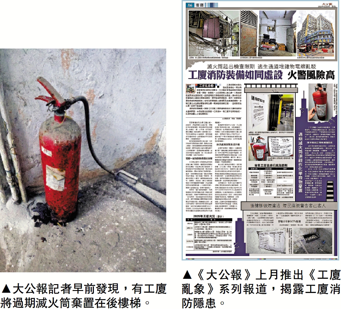 《大公報》上月底一連五日推出《工廈亂象》系列報道,記者兩個月內分別前往葵涌、觀塘、新蒲崗、土瓜灣多幢工廠大廈,了解消防設施及逃生通道狀況,結果發現部分工廈潛藏消防安全隱患,當中有位於新蒲崗的工廈滅火筒鋪滿塵垢,標示檢查限期超過一個月,後樓梯多層也有違規吸煙情況。消防處當日回覆查詢,證實部分工廈違反消防條例,上月初前往巡查後,已作出兩宗檢控,並向相關人士發出警告信。