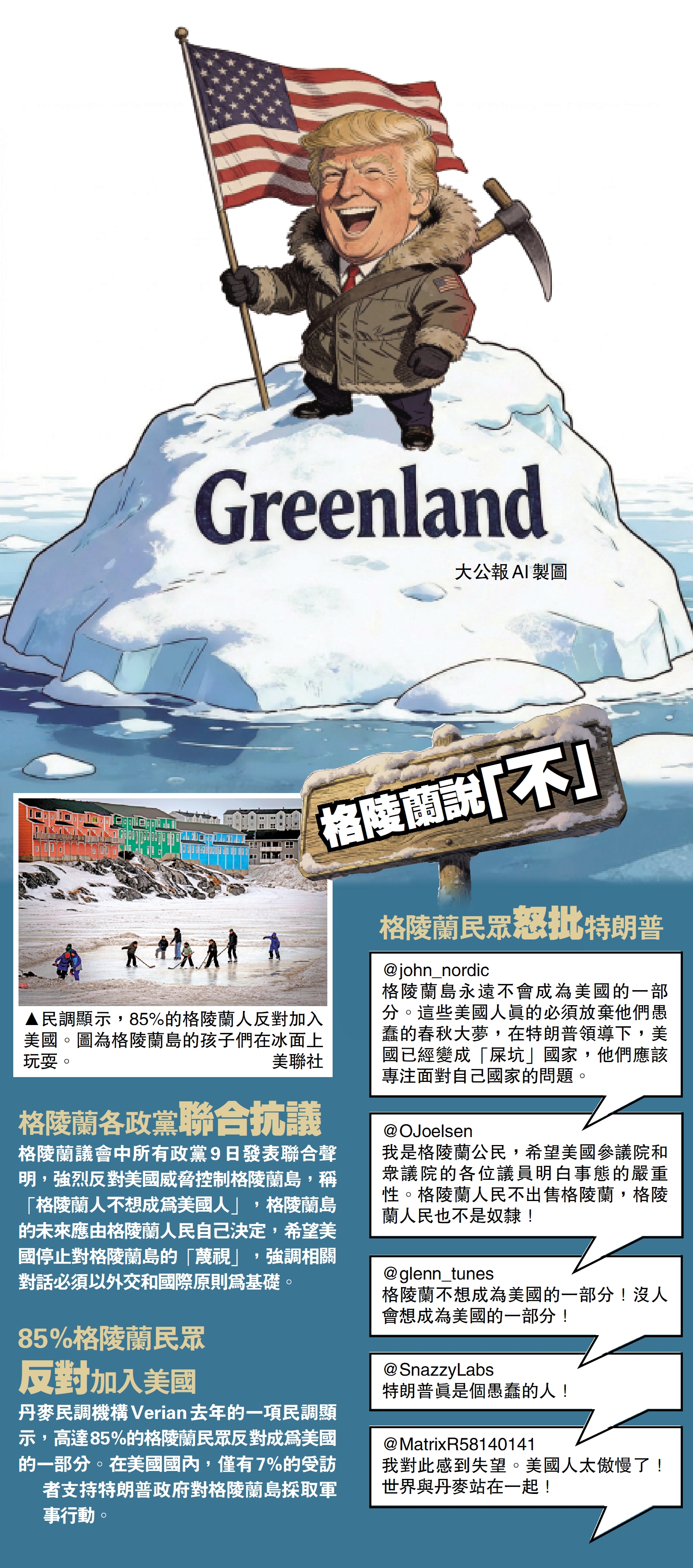 格陵蘭議會中所有政黨9日發表聯合聲明,強烈反對美國威脅控制格陵蘭島,稱「格陵蘭人不想成為美國人」,格陵蘭島的未來應由格陵蘭人民自己決定,希望美國停止對格陵蘭島的「蔑視」,強調相關對話必須以外交和國際原則為基礎。