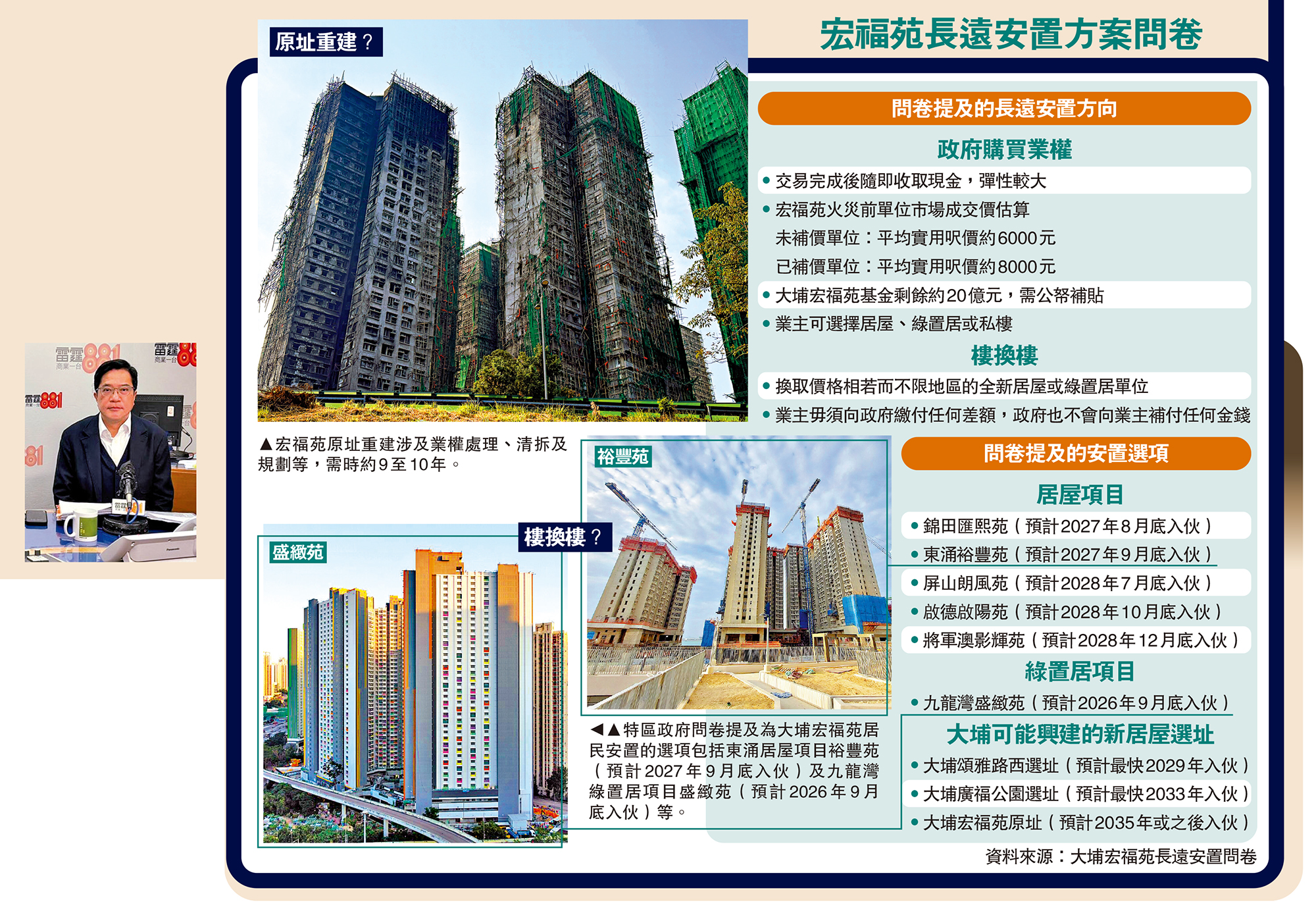眾多選項中,「樓換樓」方案最快今年9月入伙,原址重建耗時最長。財政司副司長黃偉綸(小圖)昨日表示,原址重建涉及業權處理、清拆及規劃等,需時約9至10年,形容「不太實際」,但強調願意討論。有專家認為,加上調查及保險等因素,「原址」重建可能起碼耗時近10年,建議居民優先考慮更實際方案。\大公報記者 易曉彤