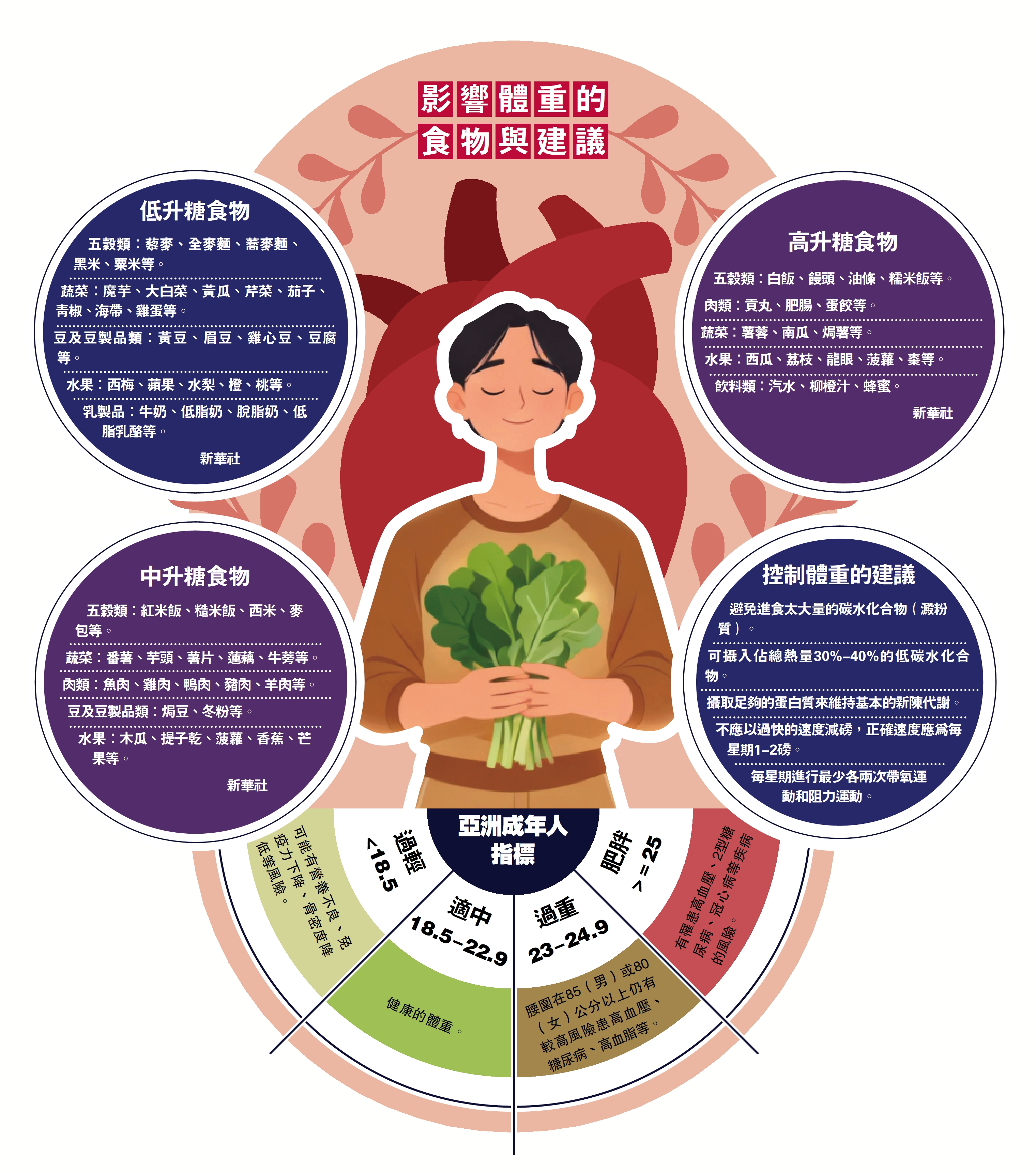 何謂過重?一般來說,醫學界會用體重指標(Body Mass Index,簡稱BMI)來評估體重是否合乎標準。計算的方法很簡單,公式為體重(公斤)除以身高(米)再除以身高(米)。亞洲成年人的理想體重指標是18.5至22.9。當指標高於理想範圍越多,患上心血管病的風險則越高。若體重指標低於理想範圍,則屬於營養不良,抵抗力會較低。