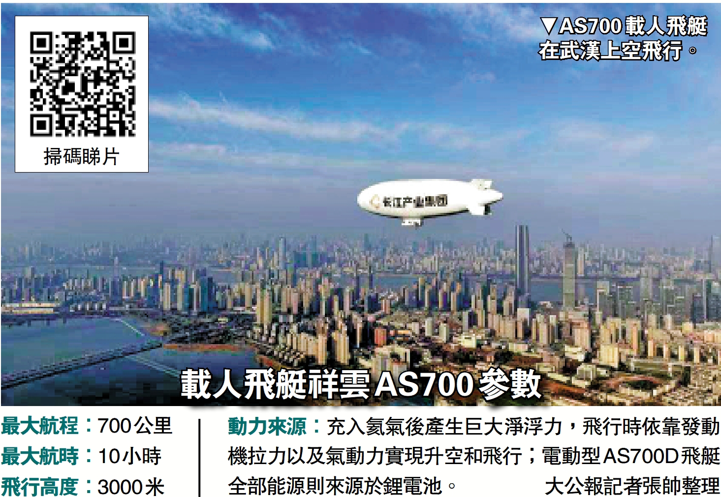 【大公報訊】記者張帥武漢報道:1月9日,剛拿下全國首張國產載人飛艇經營許可證的AS700載人飛艇,順利完成荊門至武漢往返航程,實現全國首次載人飛艇商業飛行。目前,AS700載人飛艇已獲得42架訂單。