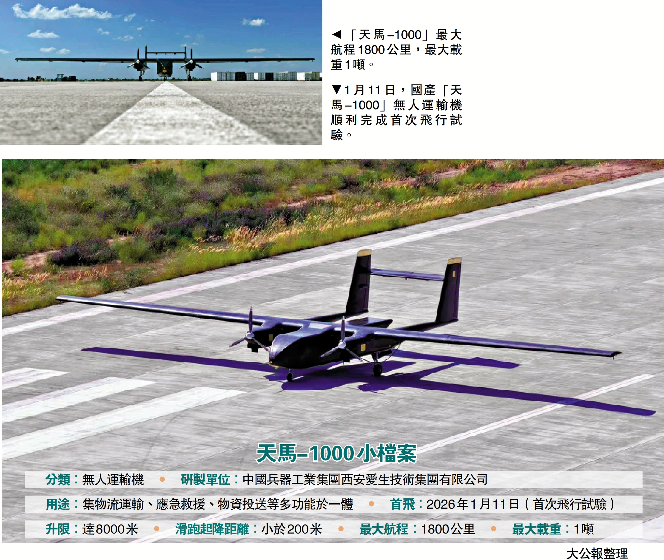 1月11日,由中國兵器工業集團西安愛生技術集團有限公司自主研發的「天馬-1000」無人運輸機順利完成首次飛行試驗,各項飛行數據表現良好,首飛取得圓滿成功。