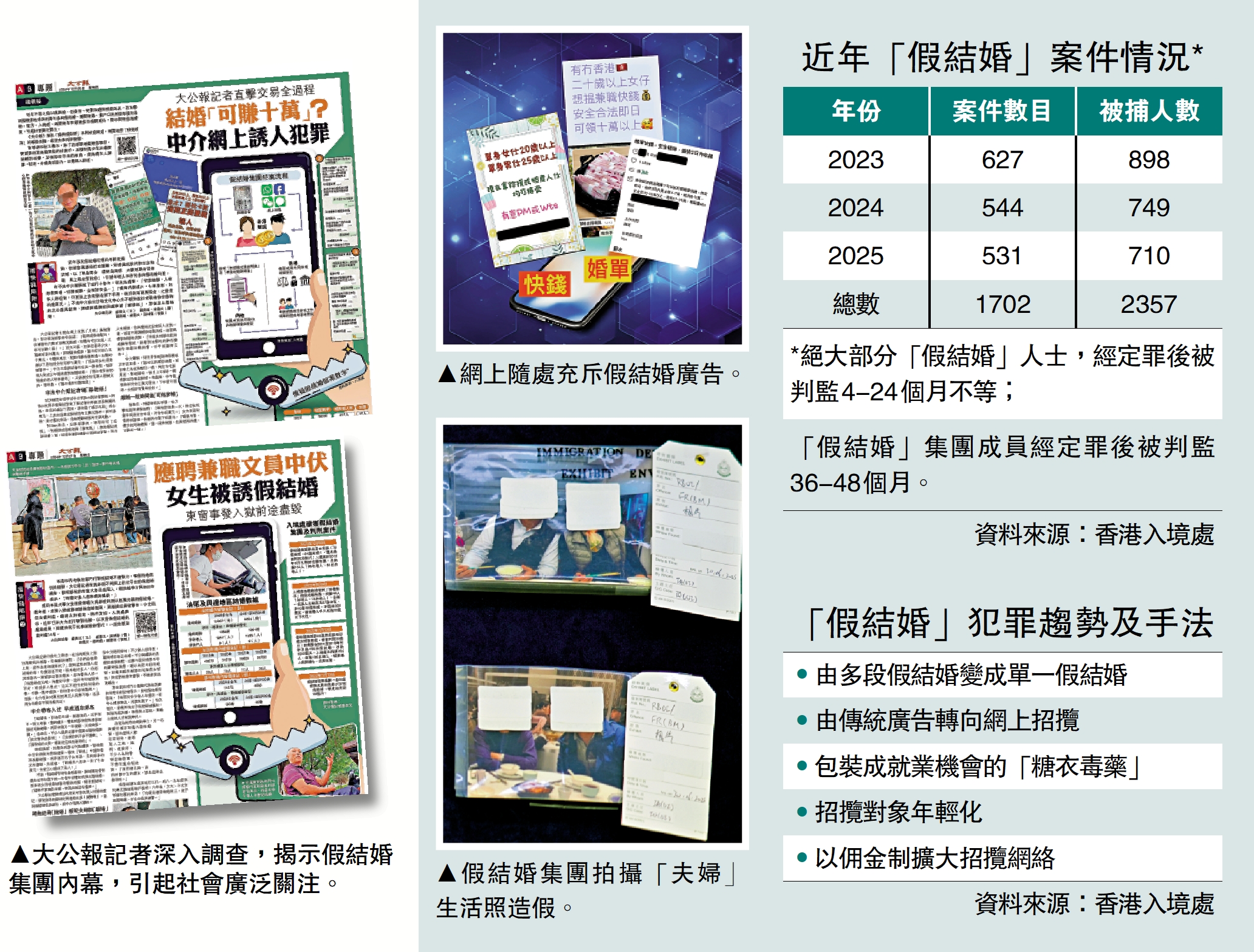 《大公報》在2024年12月刊登《搵快錢陷阱》系列報道,包括深入調查假結婚集團,記者喬裝單身人士應徵,揭發集團改變經營模式,引入介紹人佣金制等,報道引起執法部門高度重視,入境處經過深入調查,去年聯同廣東省公安廳出入境管理總隊,採取代號「閃刺2025」的聯合行動,成功瓦解一個跨境假結婚犯罪集團。