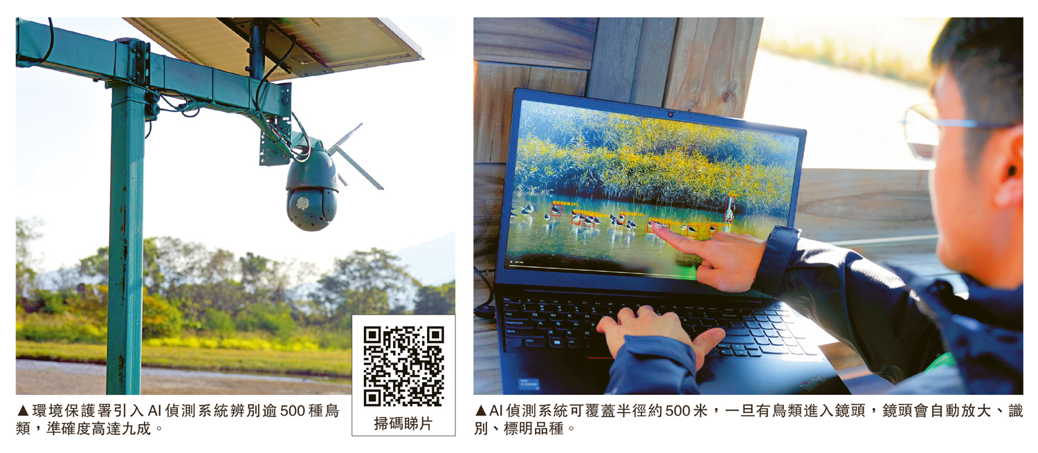 AI鳥類偵測系統已於去年四月在香港濕地公園試點推行,該系統可根據影像及聲紋,辨別逾500種鳥類,包括黑臉琵鷺、池鷺等,準確度高達九成,而且可偵測到夜鷺等隱蔽性較高的鳥類。環保署計劃,未來擴展至利用AI點算蝴蝶等具生態價值的物種。\大公報記者 黃佩琳(文) 黃洋港(圖)