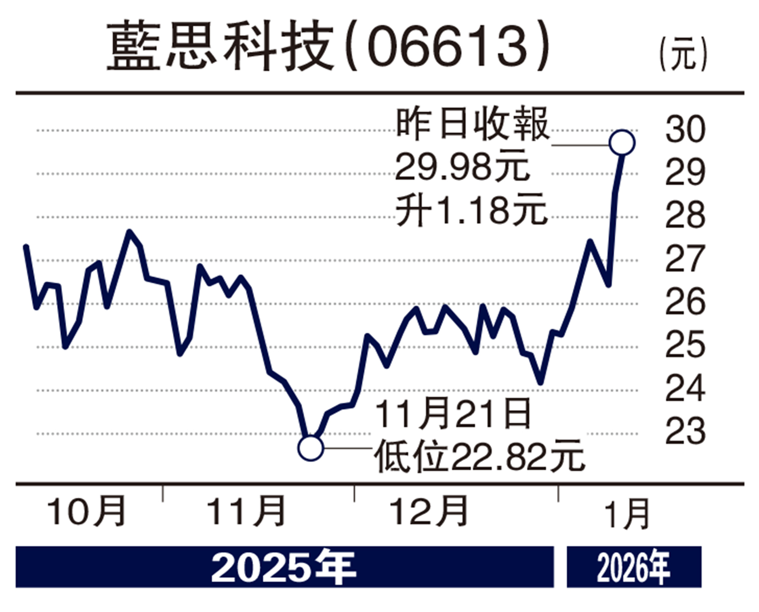 歷經三個月調整,藍思股價近日出現突破,建議候29元買入,目標價34元,跌破25元止蝕。