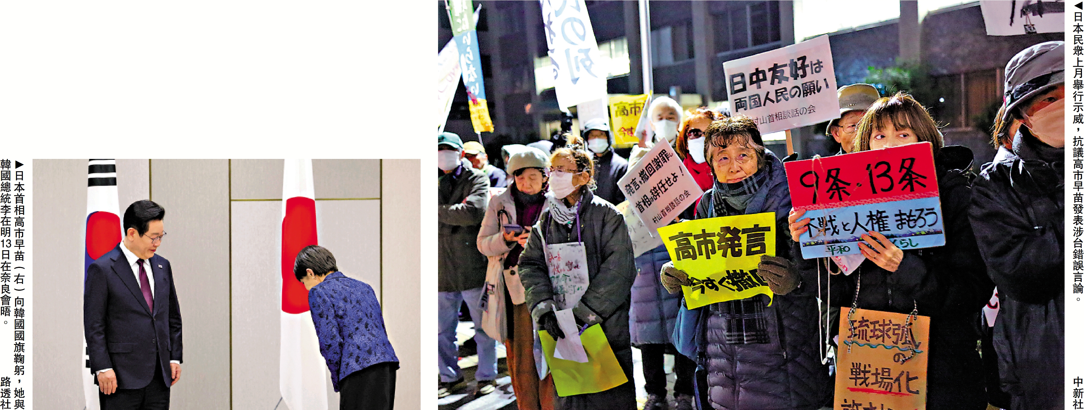 另一方面,高市早苗13日與韓國總統李在明在奈良會晤。李在明在會談後與高市早苗共同會見記者時強調,韓中日三國有必要盡可能尋求共同點並開展溝通合作。中國外交部發言人毛寧13日表示,韓日領導人會晤,是韓國和日本之間的雙邊交往。