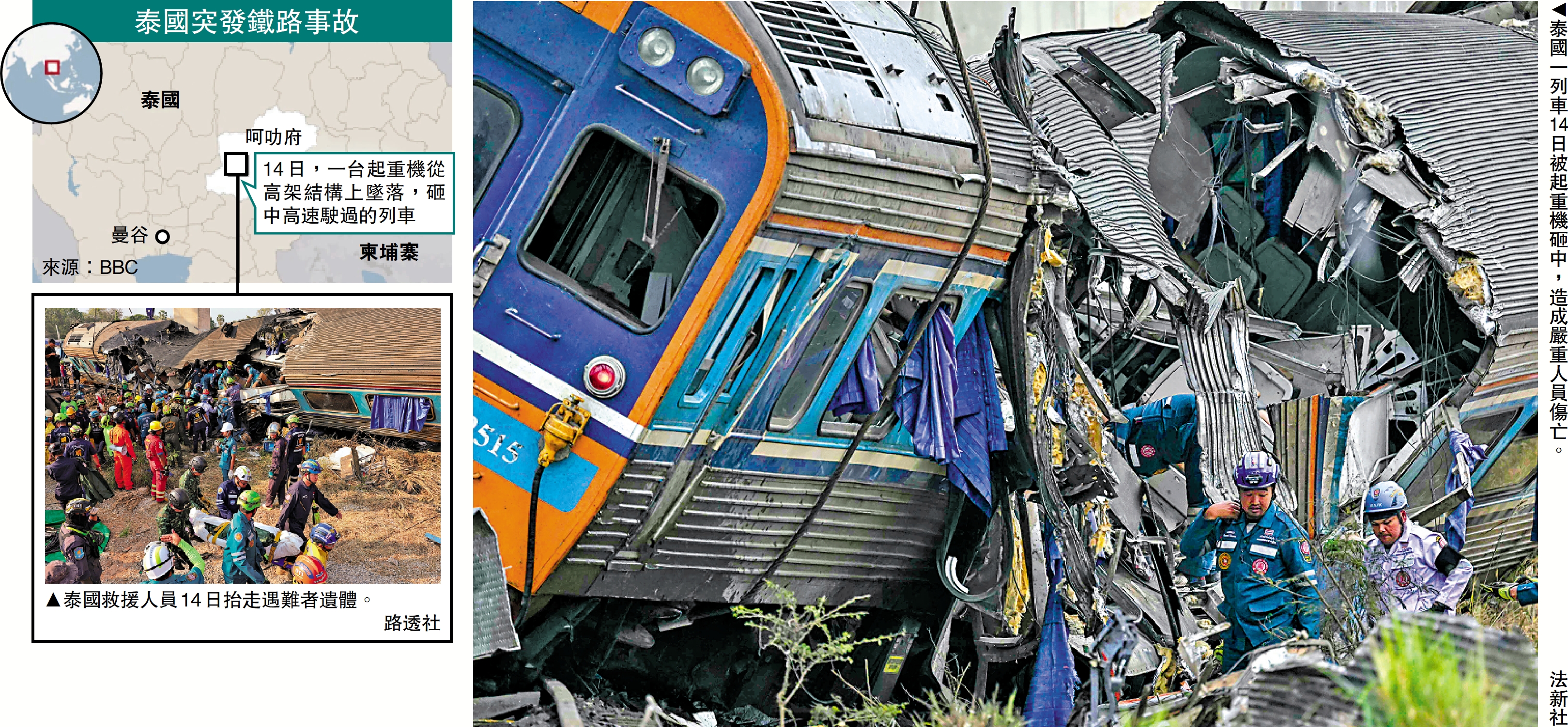【大公報訊】當地時間14日上午9時30分左右,位於泰國首都曼谷以北的呵叻府中泰高鐵項目工地上發生事故,一台在離地約10米的高架結構上作業的起重機突然倒塌並墜落,其鋼結構砸中一列高速駛過的曼谷至烏汶府快速列車,造成列車脫軌並起火。根據座位表,列車上共有195名乘客,多數為學生和工人。泰國官員14日晚些時候表示,事發時車上實際約有171名乘客。包括乘客在內的所有人員均已被疏散。根據呵叻府公共衞生辦公室發布的數據,此次事故已造成至少32人死亡、67人受傷。