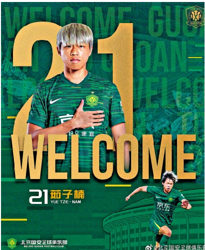 中超球會北京國安14日宣布4名新球員加盟,包括中國香港代表隊左後衛茹子楠(右圖)。國安表示茹子楠擁有充沛體能,具備應付高強度比賽的水平,同時亦能送出精準傳中球。27歲的茹子楠在2022年加盟前中超球會梅州客家,在93仗中射入7球及4次助攻。雖然上季未能幫助客家完成保級,但他仍獲多間中超球會青睞。