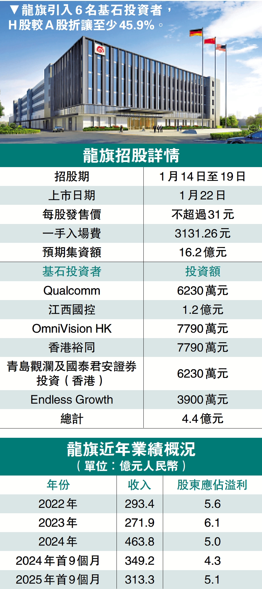 龍旗科技於2024年在A股上市,股份代碼「603341」,昨日收市報51.31元人民幣(約57.34港元),以本次IPO公開發售價上限計,H股較A股折讓幅度至少為45.9%。該公司引入6名基石投資者,包括高通旗下Qualcomm、江西國控、香港裕同、豪威集團(00501)旗下OmniVision HK等,合計認購4.4億元。