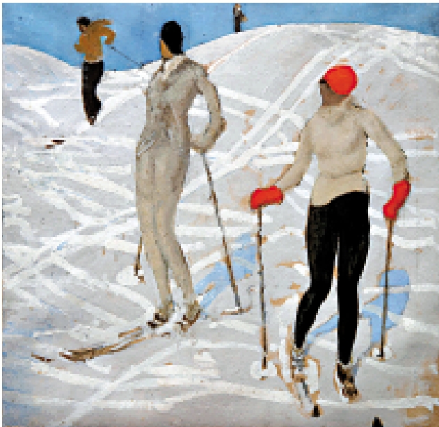 這一幕令我忽然覺得這情景眼熟,聯想起阿爾方斯·瓦爾德(Alfons Walde)的一幅畫作——兩位女滑雪者》(附圖),作於約一九二五年。瓦爾德是奧地利蒂羅爾州的著名畫家,他筆下的阿爾卑斯山充滿生機與力量。