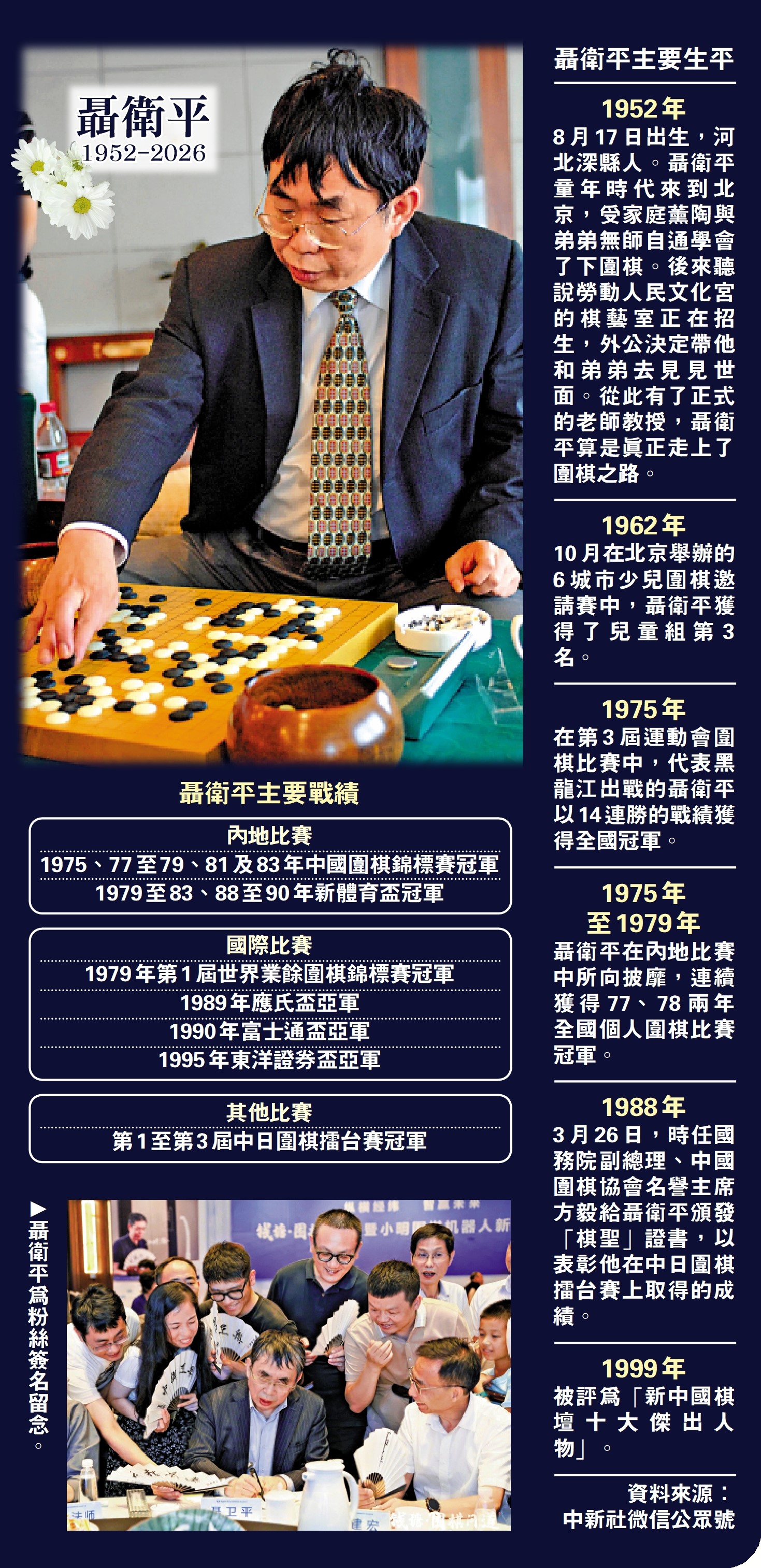 「棋聖」聶衛平離去,留下為棋奔走的一生。中國圍棋協會15日發布訃告,中國圍棋協會名譽主席、「棋聖」聶衛平九段,因病醫治無效,於2026年1月14日22時55分在北京逝世,享年74歲。從上世紀在中日圍棋擂台賽豪取11連勝的巔峰時刻,到年逾古稀仍躬身耕耘於圍棋推廣,聶衛平用一生踐行了對圍棋事業的初心與堅守。