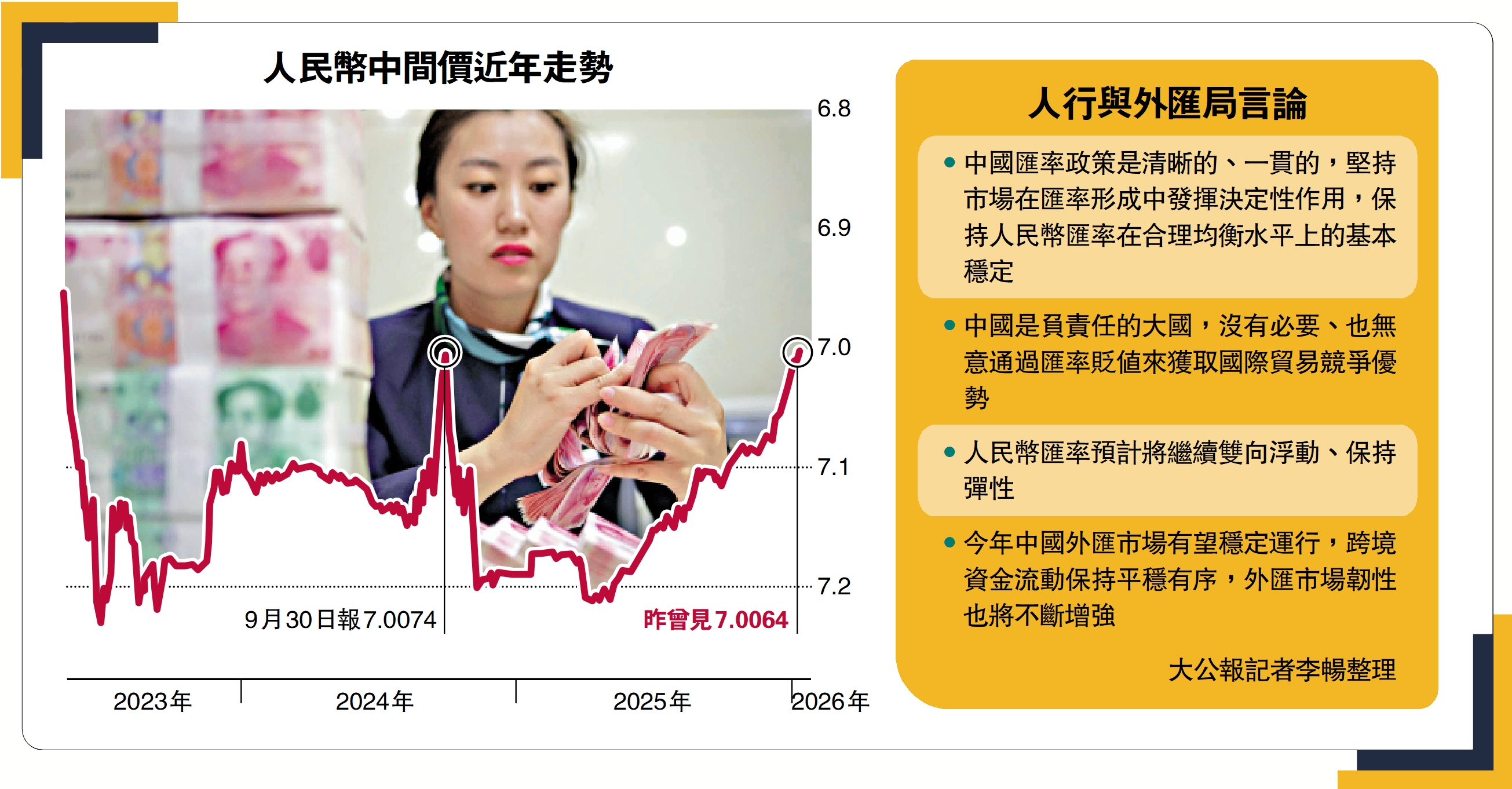 人民幣兌美元匯價持續走強。人民幣兌美元中間價及在岸日盤收盤,昨日均創32個月新高。其中,在岸人民幣收報6.9698,中間價則見7.0064,兩者皆較前一日上升56個基點。