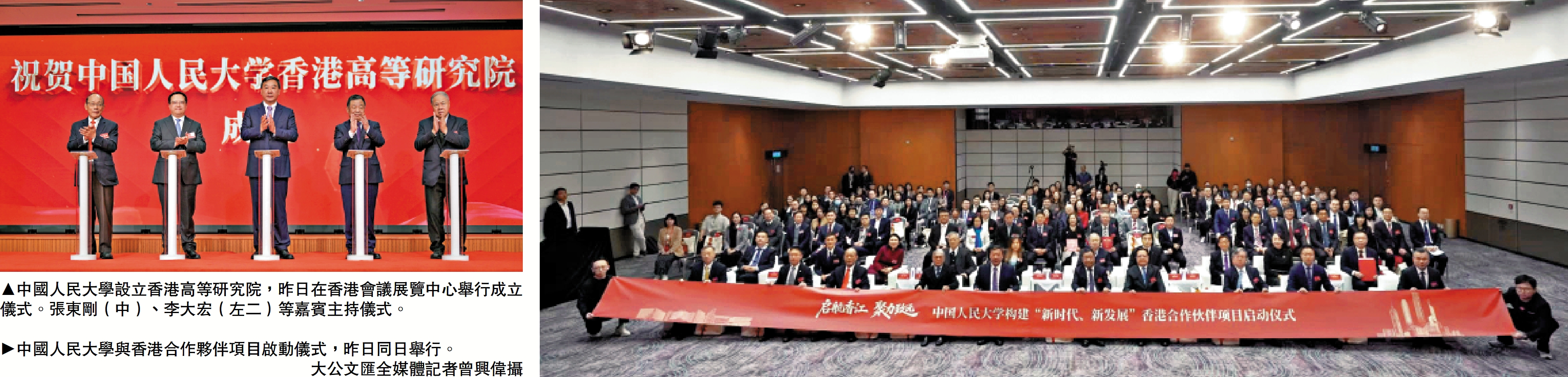 粵港澳大灣區建設,是推動「一國兩制」事業行穩致遠的重要實踐。為進一步扎根香港,開展高水平學術研究、提供優質社會服務,助力香港更深層次融入國家發展大局、不斷提升國際競爭力,中國人民大學昨日(15日)在會展舉行構建「新時代、新發展」香港合作夥伴項目啟動儀式,其中包括設立中國人民大學香港高等研究院,助力香港經濟社會高質量發展。\大公文匯全媒體記者 楊盈盈