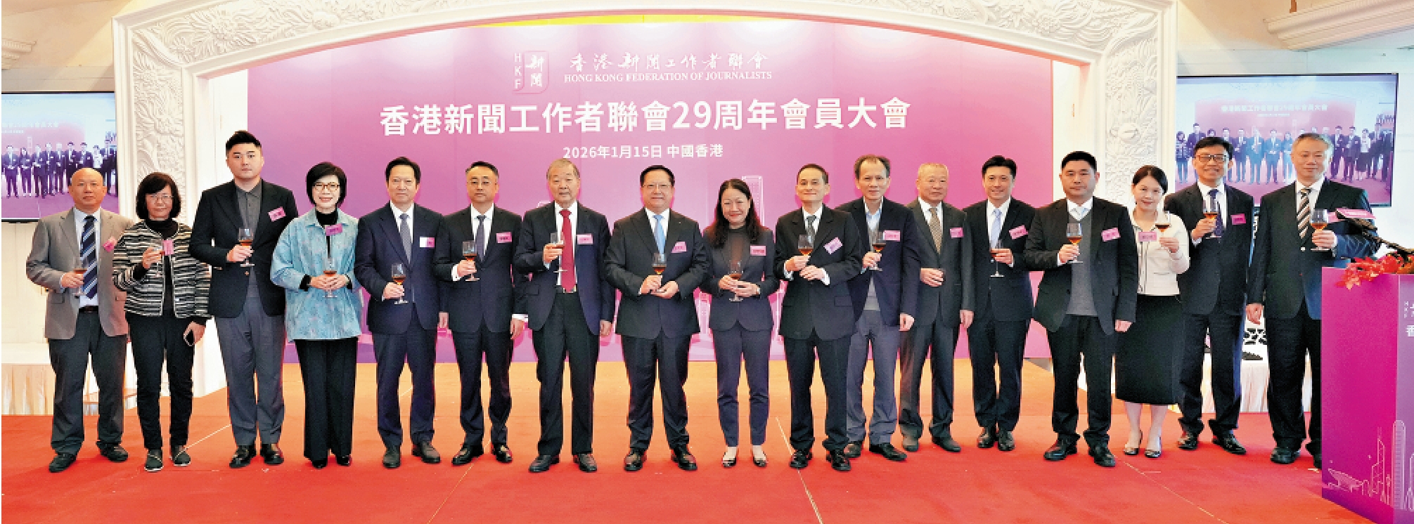 【大公報訊】記者陸九如報道:香港新聞工作者聯會成立29周年會員大會昨日(15日)在中環香港大會堂舉行。新聞聯主席李大宏、會長張國良率理事會成員,與逾400名會員代表齊聚一堂。政府新聞處處長廖李可期、中央政府駐港聯絡辦宣傳文體部副部長李曙光、行政長官辦公室新聞統籌專員謝振中擔任主禮嘉賓。與會嘉賓及會員共同回顧過去一年的耕耘與收穫,共商新階段業界團結發展之大計。