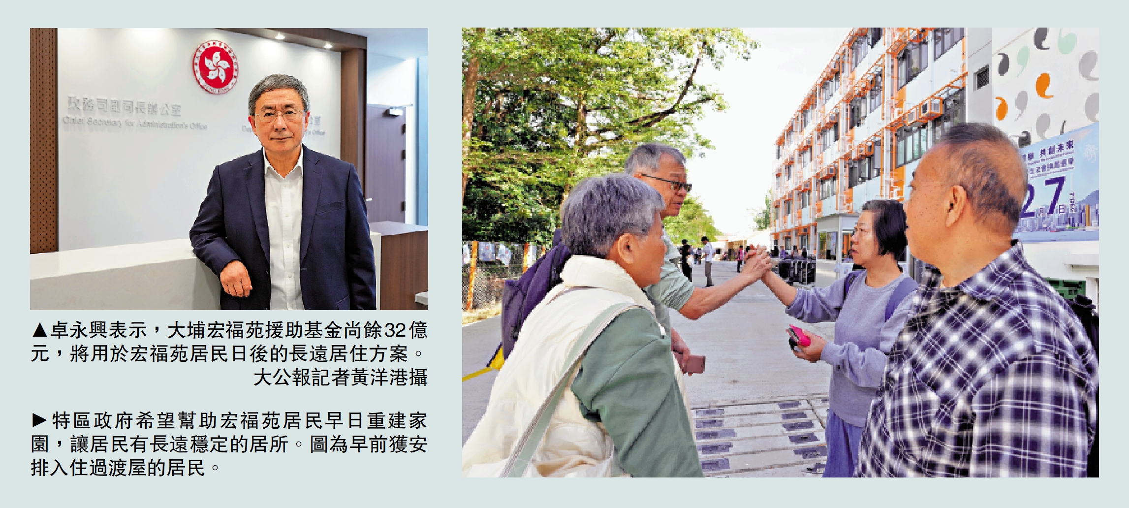特區政府於大埔宏福苑火災後,成立「大埔宏福苑援助基金」,用於向受災居民提供支援服務。政務司副司長卓永興昨日接受《大公報》訪問表示,基金總額已增至44億元,政府已推出的11項緊急援助計劃總承擔額為12億元,基金剩餘的32億元將用於宏福苑居民日後的長遠居住方案,包括收購業權,又強調「政府的投入一定是會多過目前基金的餘額」。\大公報記者 易曉彤