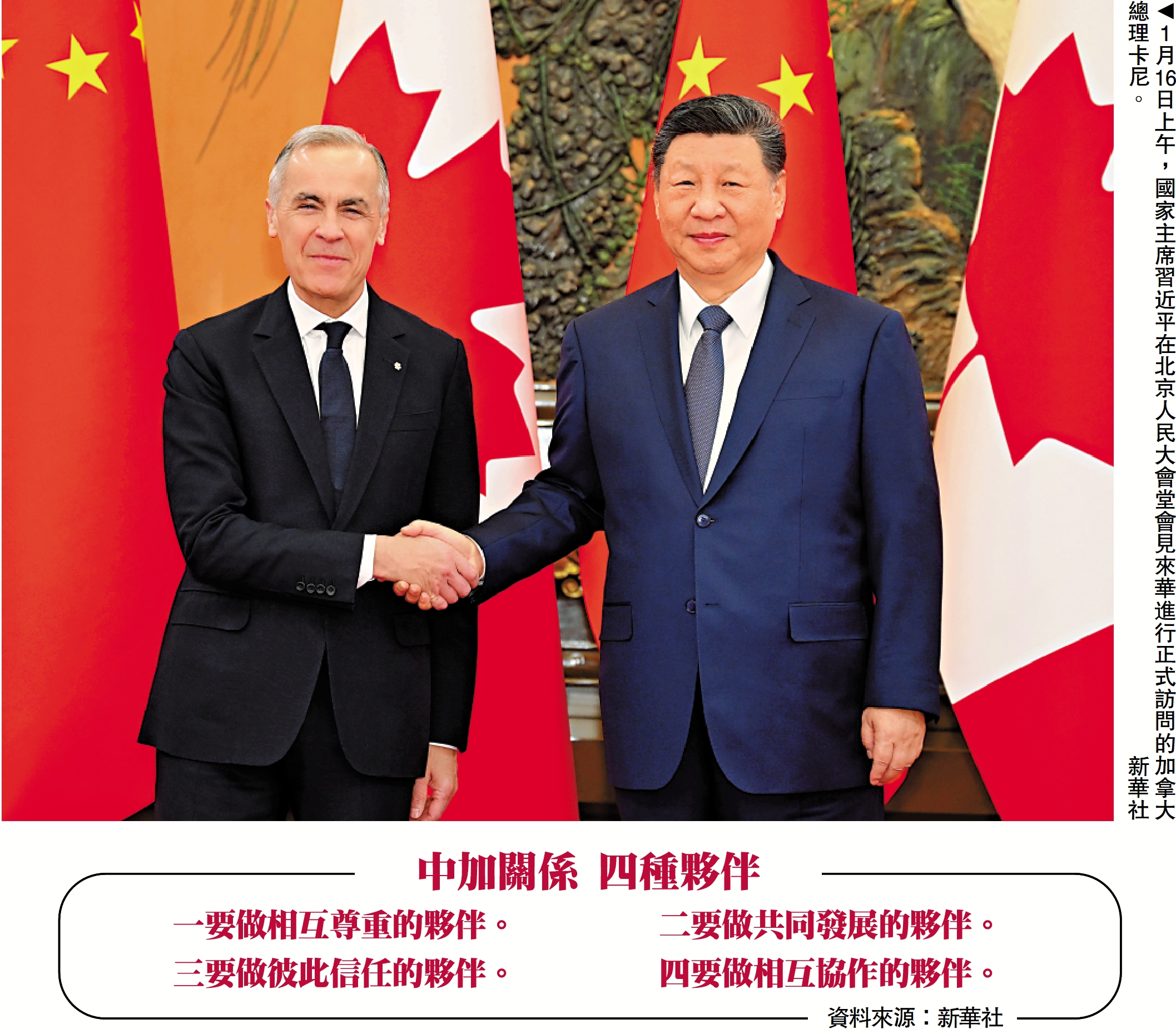 【大公報訊】據新華社報道: 習近平指出,去年10月,我們在韓國慶州會見,開啟了中加關係轉圜向好的新局面。雙方就恢復和重啟各領域合作深入探討,取得積極成果。中加關係健康穩定發展符合兩國共同利益,也有利於世界和平穩定和發展繁榮。雙方要本着對歷史、對人民、對世界負責任的態度,推進構建中加新型戰略夥伴關係,推動中加關係邁入健康、穩定、可持續的發展軌道,更好造福兩國人民。