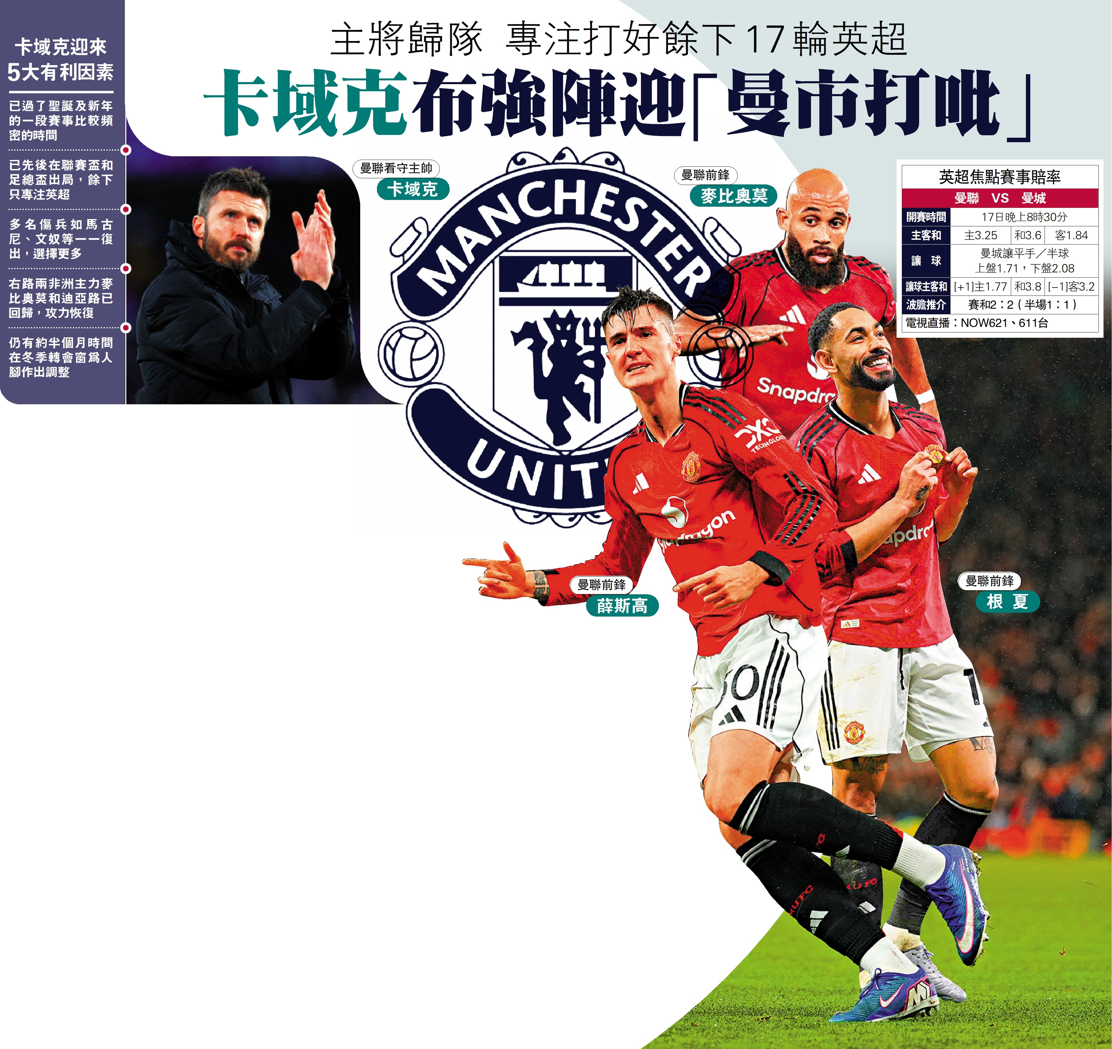 「紅魔鬼」曼聯日前正式委任名宿卡域克再當暫代主帥直至季尾,而他此刻接手就適逢多項有利因素,包括已過頻密賽程、餘下單一戰線應付英超、陣中傷兵陸續復出、主力非洲兵已回歸以及尚有約兩周時間在冬季轉會窗彌補不足,若卡域克能把握住這股東風,並由今晚英超早場「曼市打吡」主場大戰曼城之役開始起航,也許即使卡域克面對着的是一大個「爛攤子」,但仍然有可能讓「紅魔鬼」死而復生。\大公報記者 譚德龍