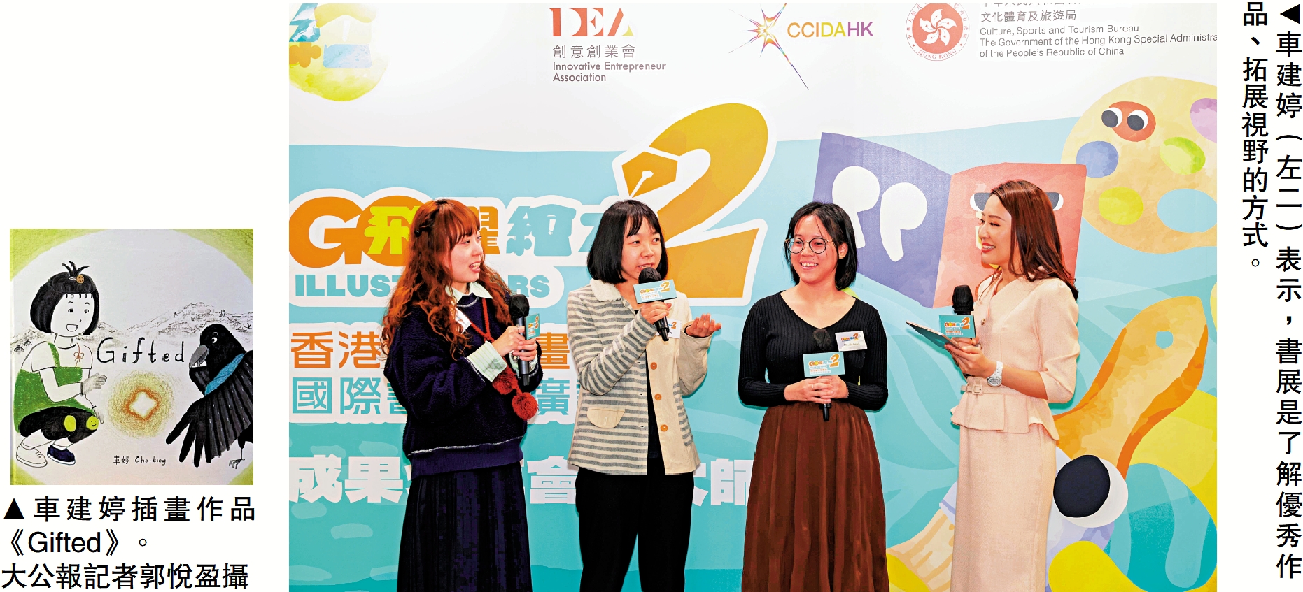 插畫師車建婷則分享,在書展現場,她特別留意過往得獎作品,認為這是拓展視野的極佳方式。透過觀察不同城市、不同文化背景的作品呈現,她也由此重新思考自己的創作方向。這種對城市與價值的思考,亦體現在作品《Gifted》之中。車建婷在採訪中表示,《Gifted》以城市中被忽略的角落為背景,透過小女孩與烏鴉的相遇,描繪「無用之物」如何被重新看見與理解。隨着故事推進,畫面由黑白逐漸轉為彩色,象徵城市在被注視後所產生的微小改變。