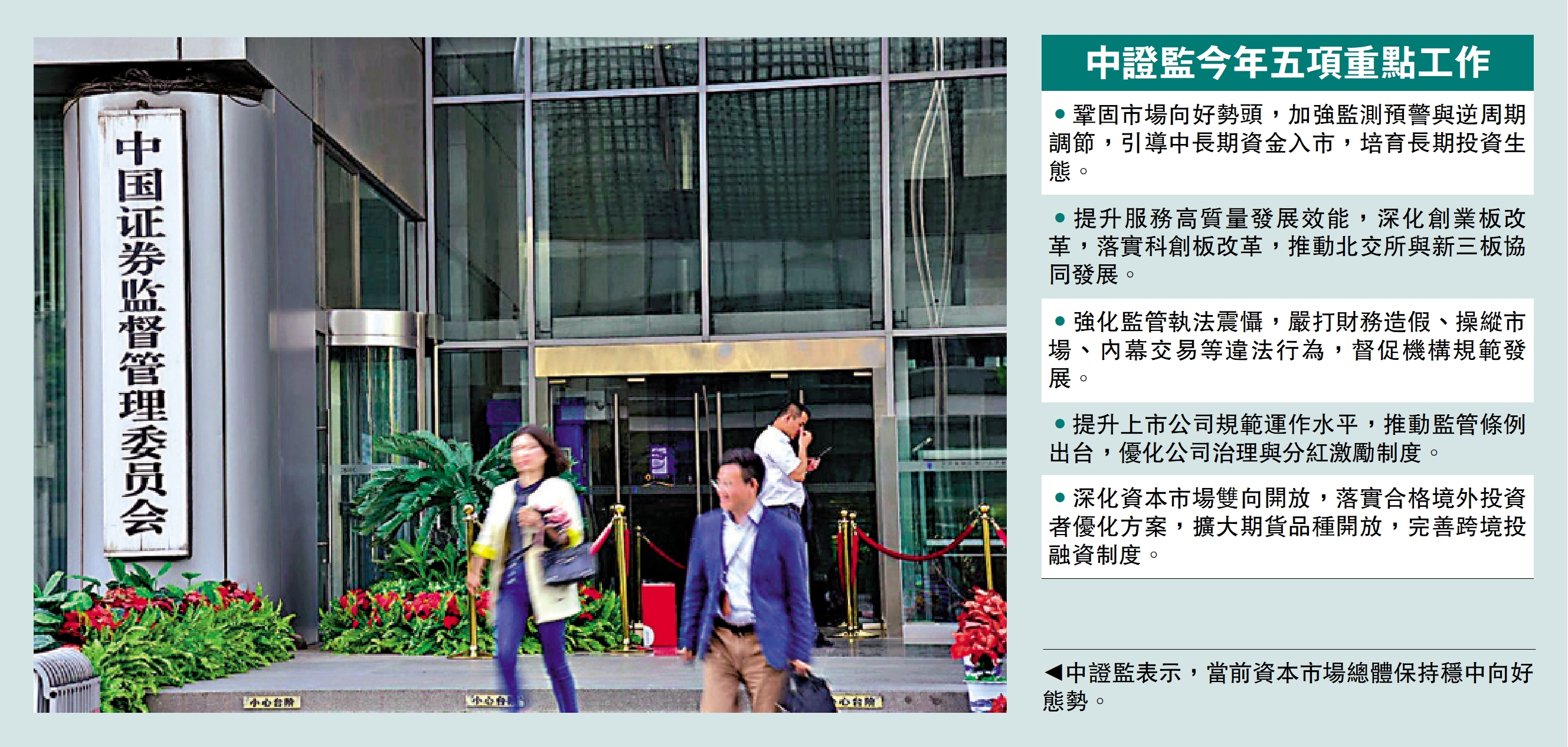 中國證監會日前召開2026年系統工作會議。證監會黨委書記、主席吳清出席會議並講話。會議指出,當前資本市場總體保持穩中向好態勢,但仍面臨內外風險交織、新舊矛盾疊加的複雜嚴峻挑戰。會議強調,今年工作將重點圍繞五方面展開:持續鞏固市場穩中向好勢頭,提升服務高質量發展質效,推動資本市場雙向開放邁向更深層次、更高水平等,進一步助力穩就業、穩企業、穩市場、穩預期,為「十五五」良好開局貢獻力量。\大公報記者 白悅鳴
