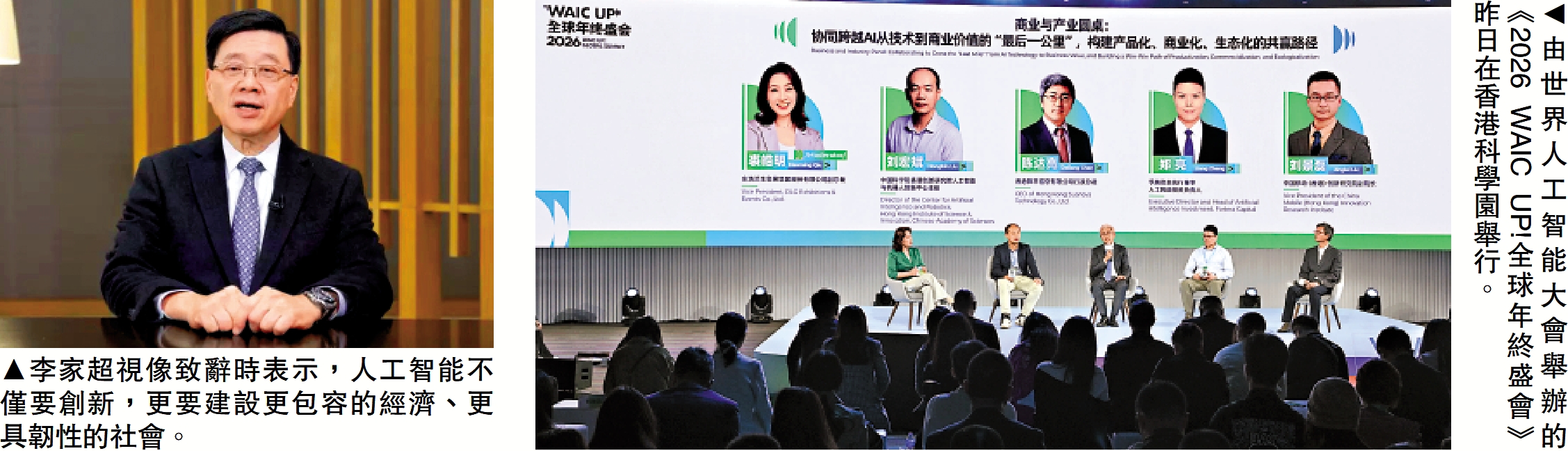 【大公報訊】記者陳劍報道:憑藉「背靠祖國、聯通世界」的獨特優勢,香港已成為國際AI交流與產業合作的核心樞紐。由世界人工智能大會(WAIC)舉辦的《2026 WAIC UP!全球年終盛會》首次進駐香港,於昨日(16日)在香港科學園舉行。本次《2026 WAIC UP!年終盛會》主題為《WAKE UP MORE》,分三場舉行,上午場「開年預測 趨勢分享」,下午場「行業應用 創投風向 青年觀察與全球機遇」,夜晚場「跨界鏈接 碰撞可能」。本次大會吸引了5萬人線上線下參加,展現香港科技融合全球視野、前沿理念與務實合作的優勢,踐行全球互聯的願景。
