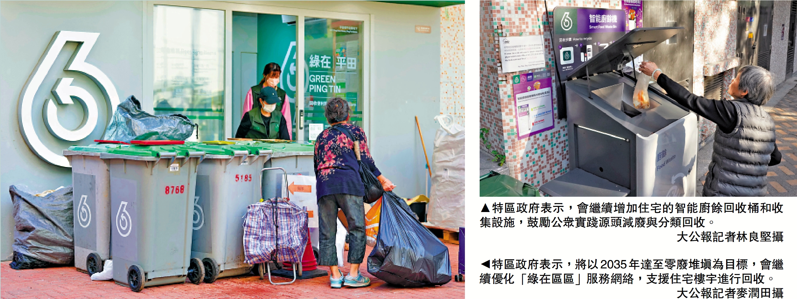 大公報記者昨日走訪多個「綠在區區」回收站點及設有智能廚餘回收桶的屋邨,不少市民認為政府持續完善回收網絡,有助鼓勵分類回收。有公屋居民認為,提升積分獎賞可增加分類回收誘因;有私樓住戶建議在單幢樓較多的社區增設廚餘回收設施;有市民期望區區有回收點。\大公報記者 黃佩琳、鄭文迪