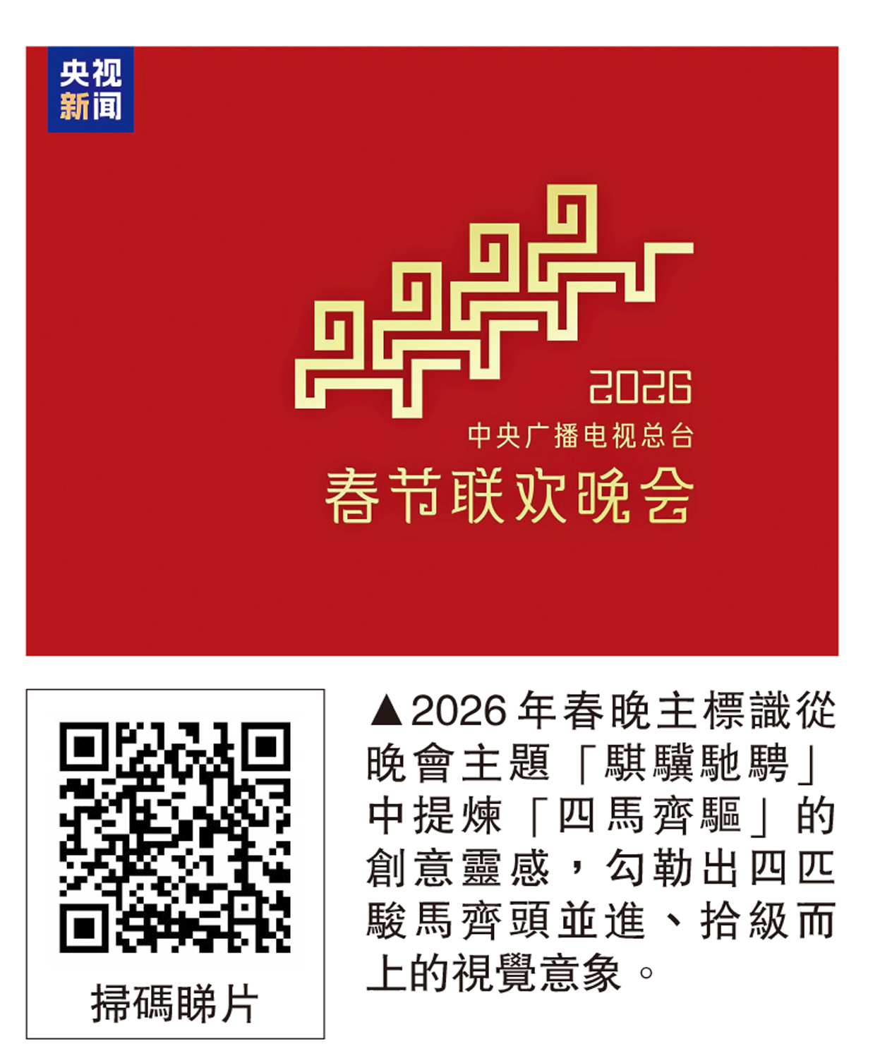 【大公報訊】記者張寶峰北京報道:中央廣播電視總台《2026年春節聯歡晚會》17日順利完成首次綵排。各類型節目與創新技術應用、舞美視覺設計等要素完成融合,各環節流程銜接順暢,晚會整體效果初顯。央視馬年春晚堅持「歡樂吉祥、喜氣洋洋」的主基調,以「騏驥馳騁 勢不可擋」為主題,在文化滋養與科技賦能下,呈現活力滿滿、蒸蒸日上的新時代奮進氣象。