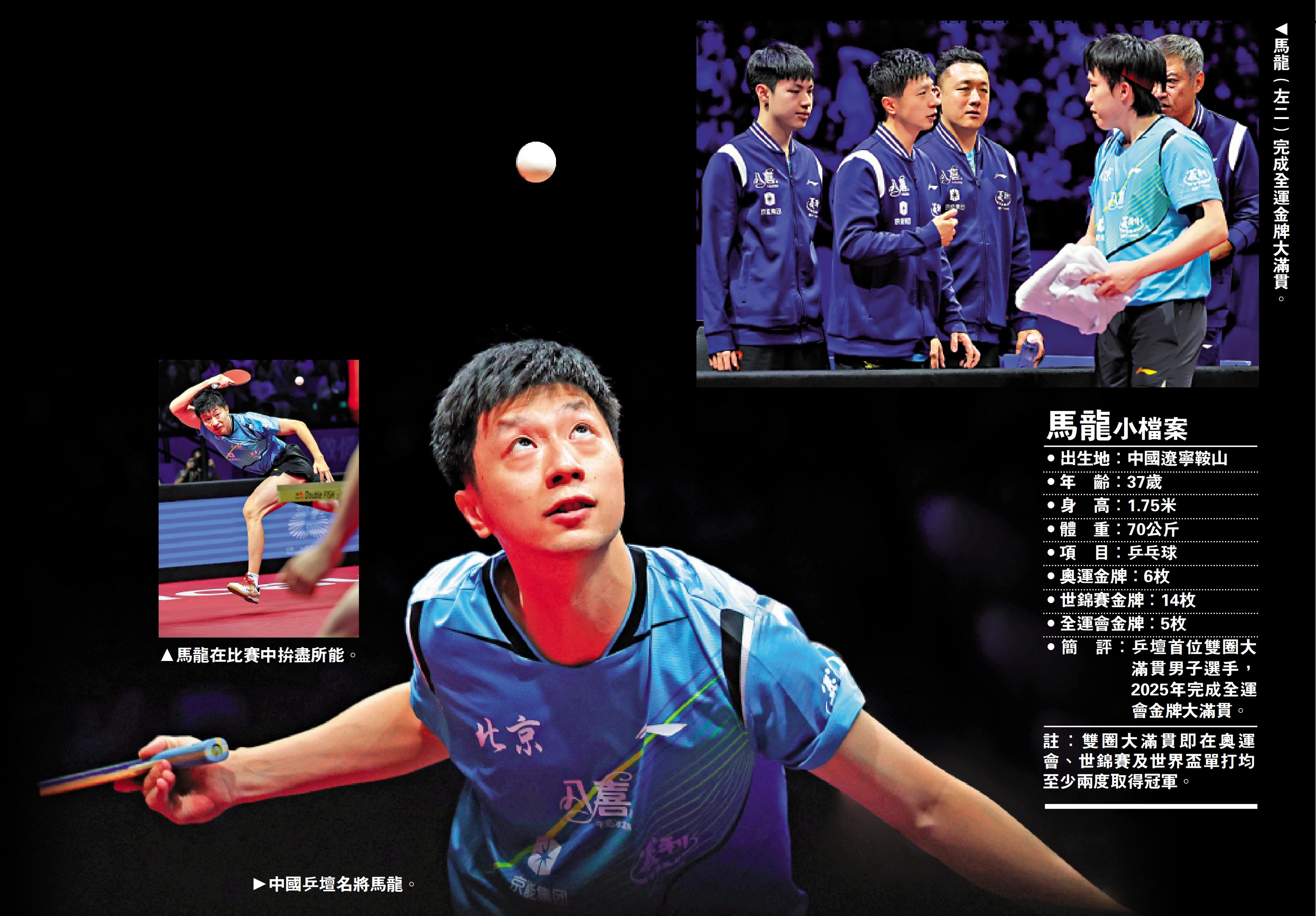 這是37歲的馬龍第六次參加全運會,他沒有參加單打項目,而是將全部精力投入到團體比賽。在他一眼望不到頭的冠軍頭銜裏,還缺少一個全運會團體冠軍。