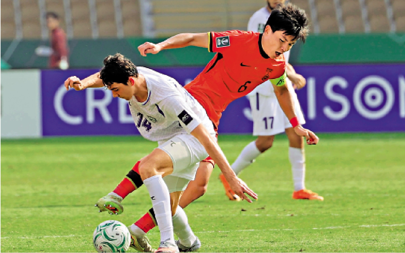 圖﹕徐彬(右)與烏茲別克斯坦隊球員圖爾昆別科夫在比賽中拚搶。\新華社
