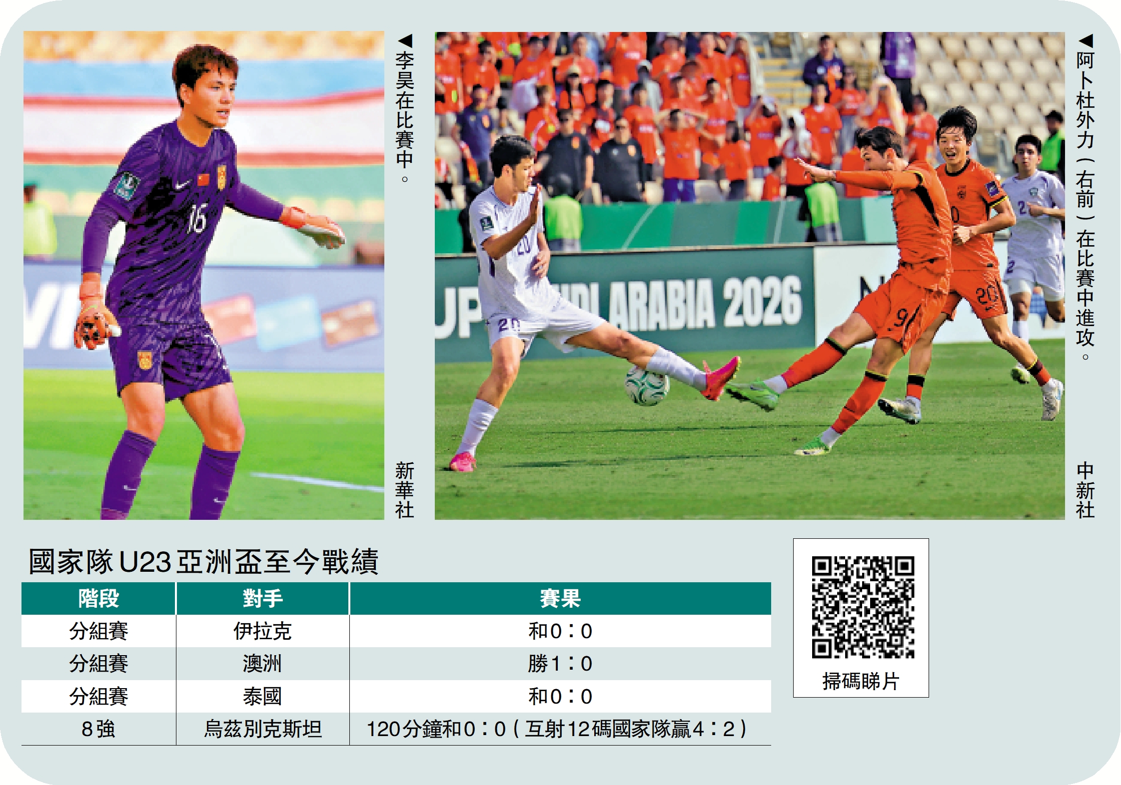 由沙特阿拉伯主辦的U23亞洲盃,17日晚繼續舉行8強賽事,以D組次名身份首次晉級的中國男子U23足球隊,與C組首名烏茲別克斯坦爭奪4強席位。國足小將頑強抵抗烏茲別克的猛攻,在法定時間90分鐘連同加時30分鐘均力保不失下踢成0:0,雙方要以互射12碼分勝負,最終國足贏4:2,歷史性晉級4強。晉級後,U23國家隊將在20日與越南爭奪決賽資格。