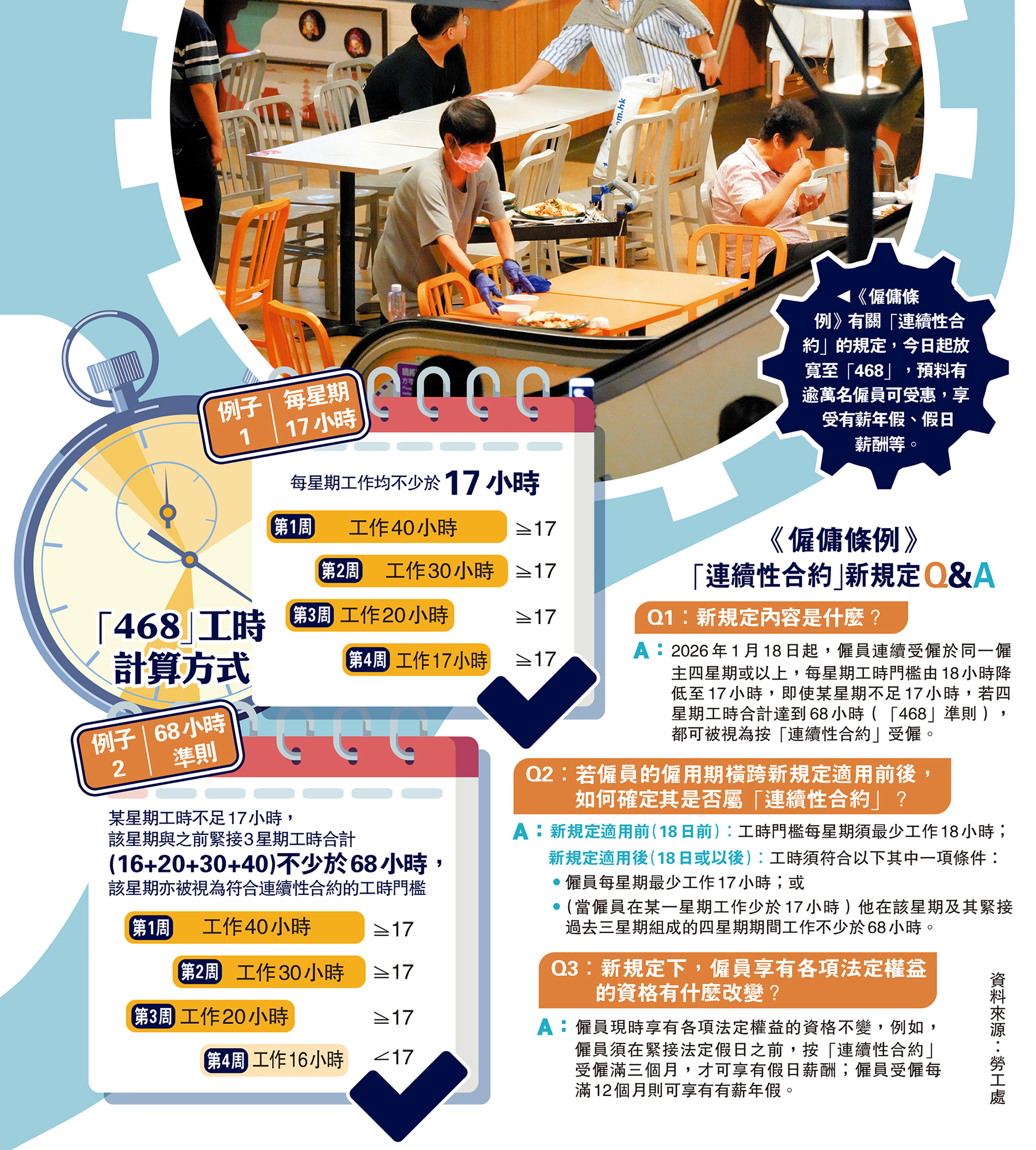 A:2026年1月18日起,僱員連續受僱於同一僱主四星期或以上,每星期工時門檻由18小時降低至17小時,即使某星期不足17小時,若四星期工時合計達到68小時(「468」準則),都可被視為按「連續性合約」受僱。