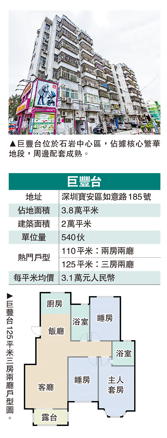 巨豐台又名苑都新村,位於石岩中心區,為1998年建成的老牌商品房小區,共3幢樓,提供540伙。雖然樓齡已28年,但以佔據核心地段和成熟的配套,至今仍是石岩片區典型的剛需客自住之選。