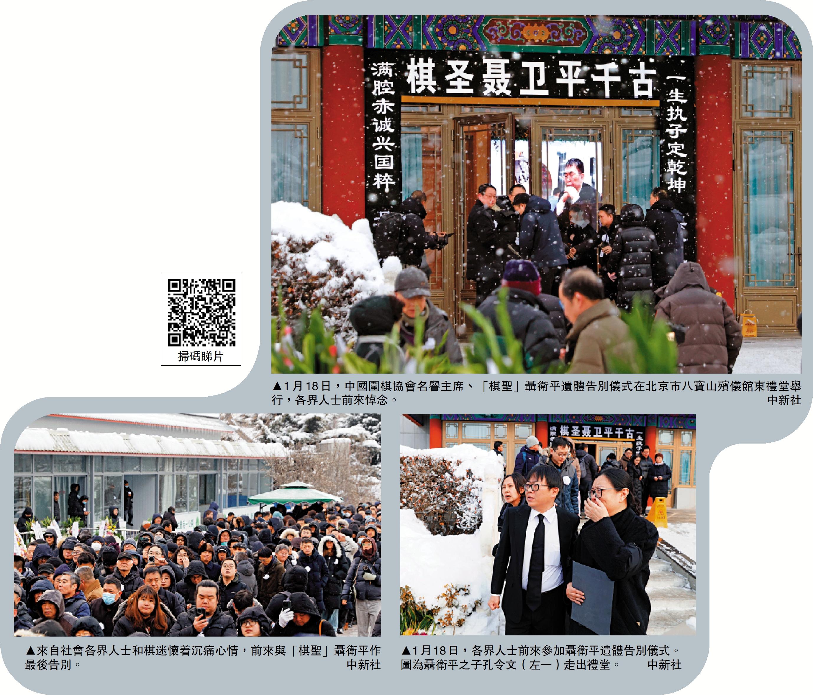 風雪送「棋聖」,紋枰別「旋風」。1月18日上午,中國著名圍棋大師、中國圍棋協會名譽主席、國家圍棋隊原總教練聶衛平告別儀式在北京八寶山殯儀館東禮堂舉行。在八寶山殯儀館,上千人冒雪趕來送「棋聖」聶衛平最後一程。
