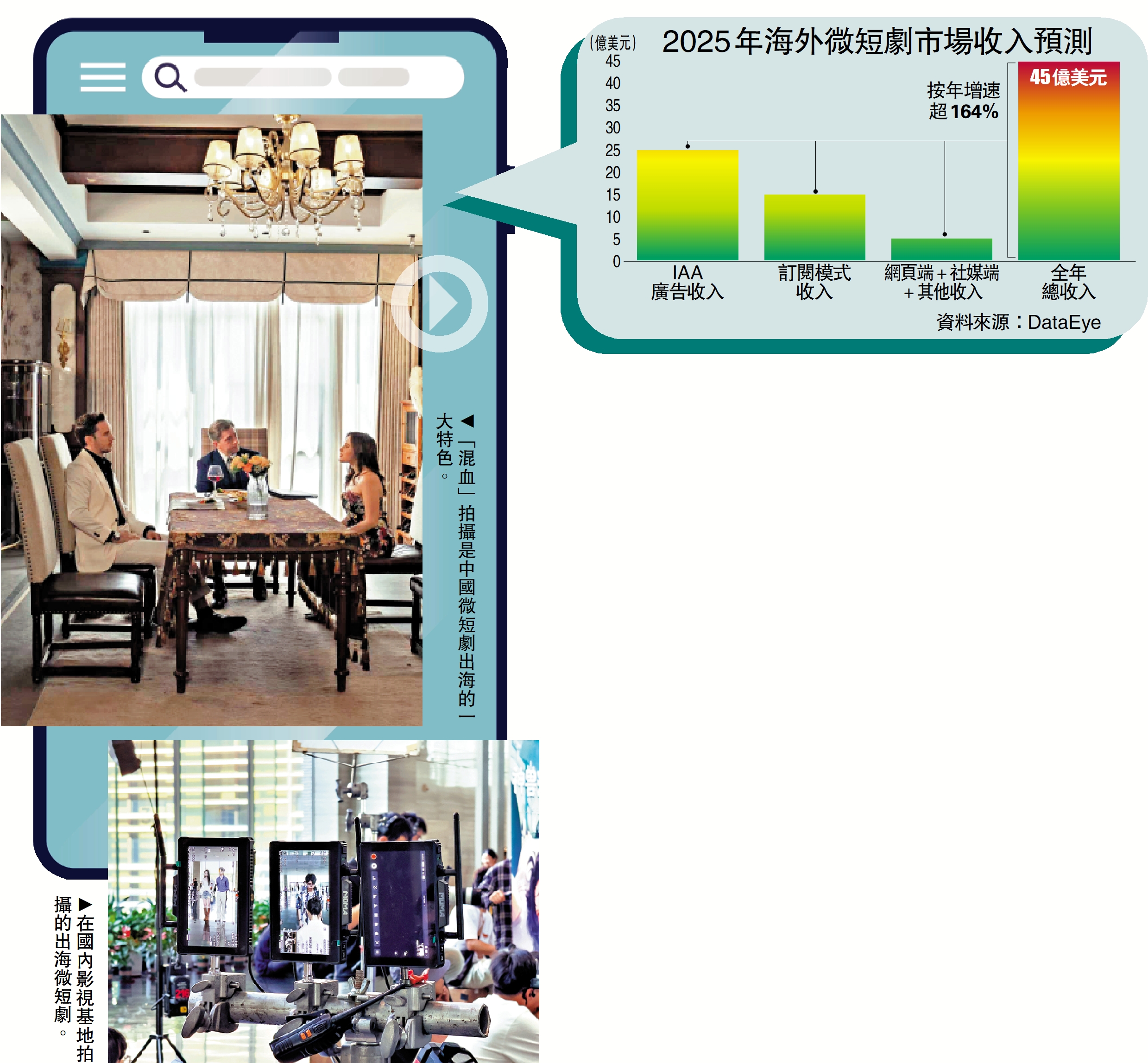 「混血」拍攝是中國微短劇出海的一大特色:中國團隊主導策劃,搭配海外演員演繹,模式靈活高效。「目前主要有兩種『混血』拍法:一是中國導演帶劇本赴海外,聘請當地團隊與演員拍攝;二是在國內影視基地拍攝,僅演員為外籍,其他均為中國團隊,成本可降低不少。」