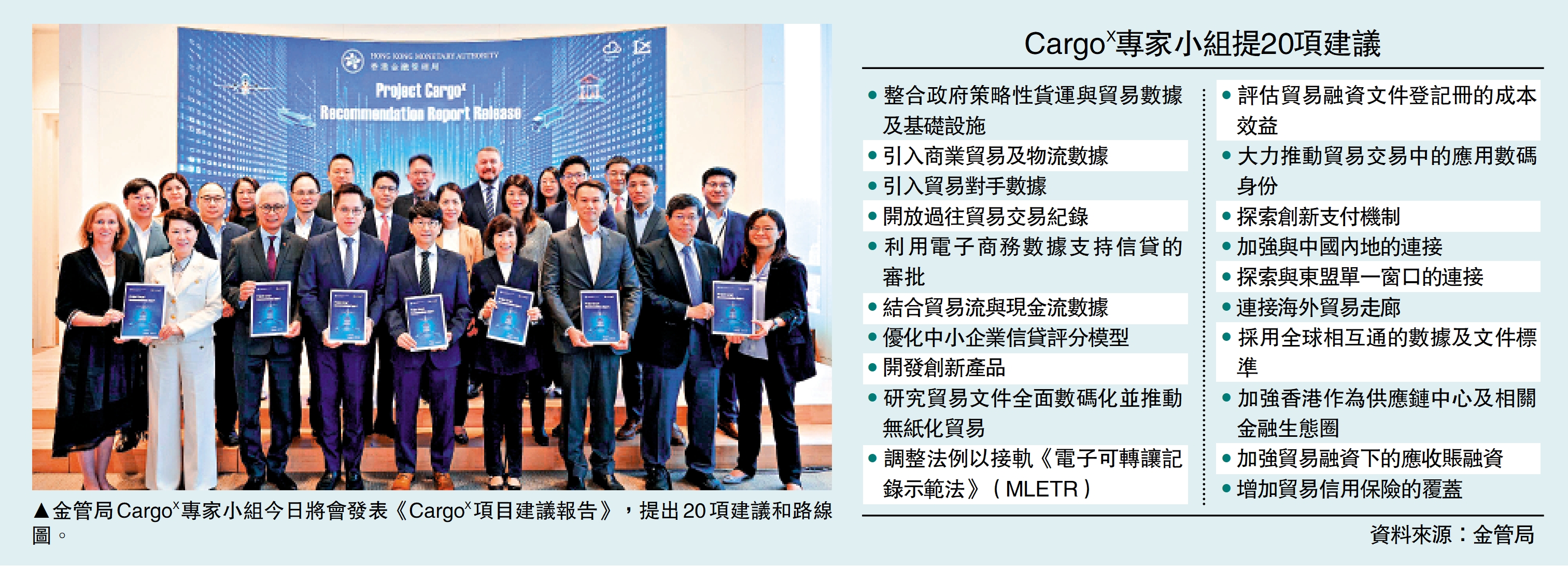由香港金融管理局成立的「CargoX專家小組」,在經過八個月的研究及與業界交流之後,今日(1月19日)正式發表《CargoX項目建議報告》。報告以數據、基建和互聯三大策略支柱為主軸,提出20項建議(見表),勾畫落實各項建議的路線圖,冀推動香港貿易融資生態現代化。