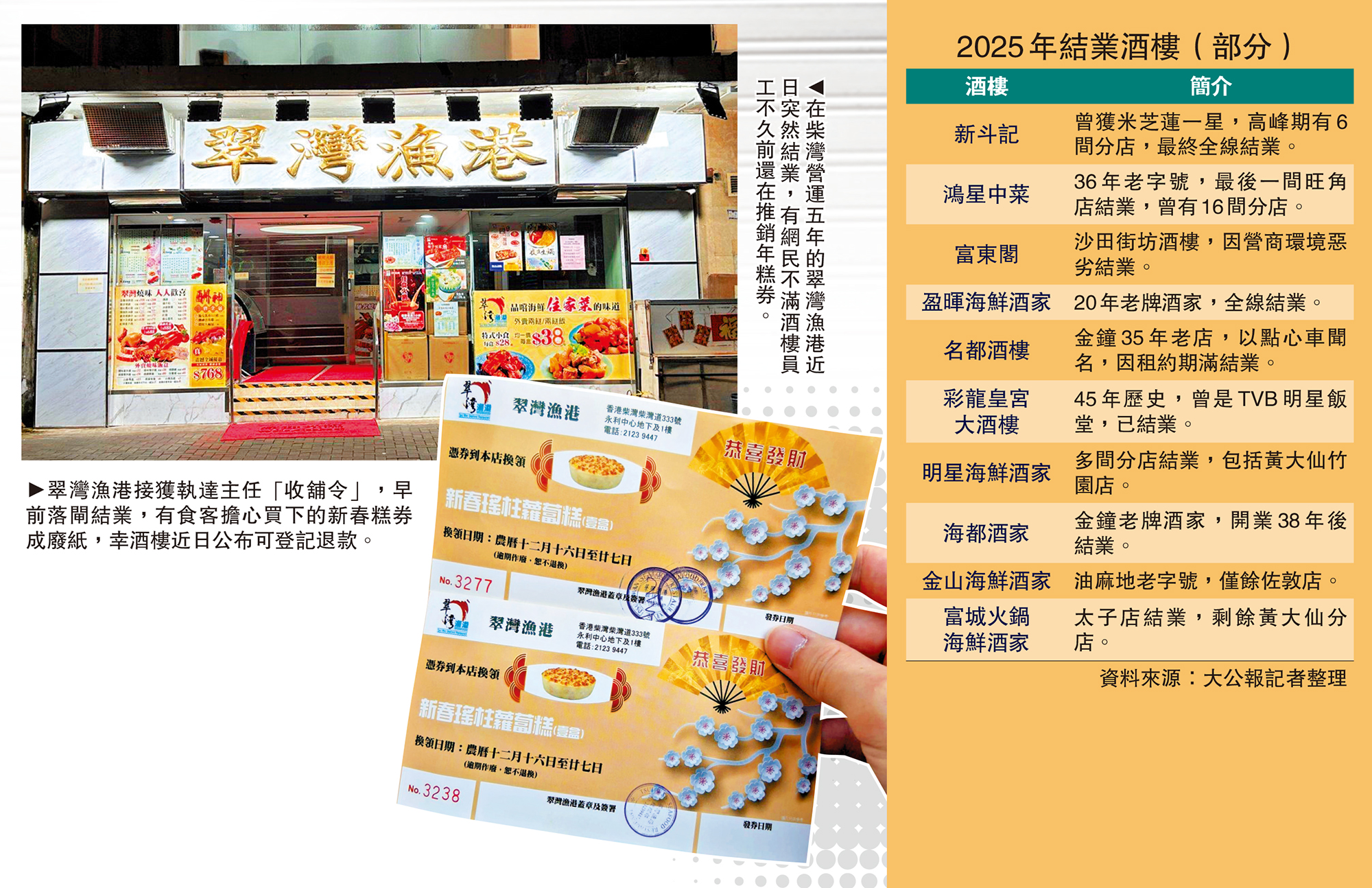 營運五年的柴灣「翠灣漁港」酒樓近日突然結業,有附近居民感到惋惜之餘,亦有人感到不滿。有網民指出,不久前酒樓員工還在推銷年糕券,家人也購買了幾張,現時酒樓突然結業,年糕券形同廢紙。近日多個酒樓或飲食討論區也有網民反映,各區酒樓有員工在食客享受美食時,突然上前推銷年糕券,形容感到很掃興,甚至構成滋擾;不過也有人認為,「平時有些茶客不用排隊,日日都有固定茶位,服務周到,過時過節就應該『識做』,買兩張糕券啦。」