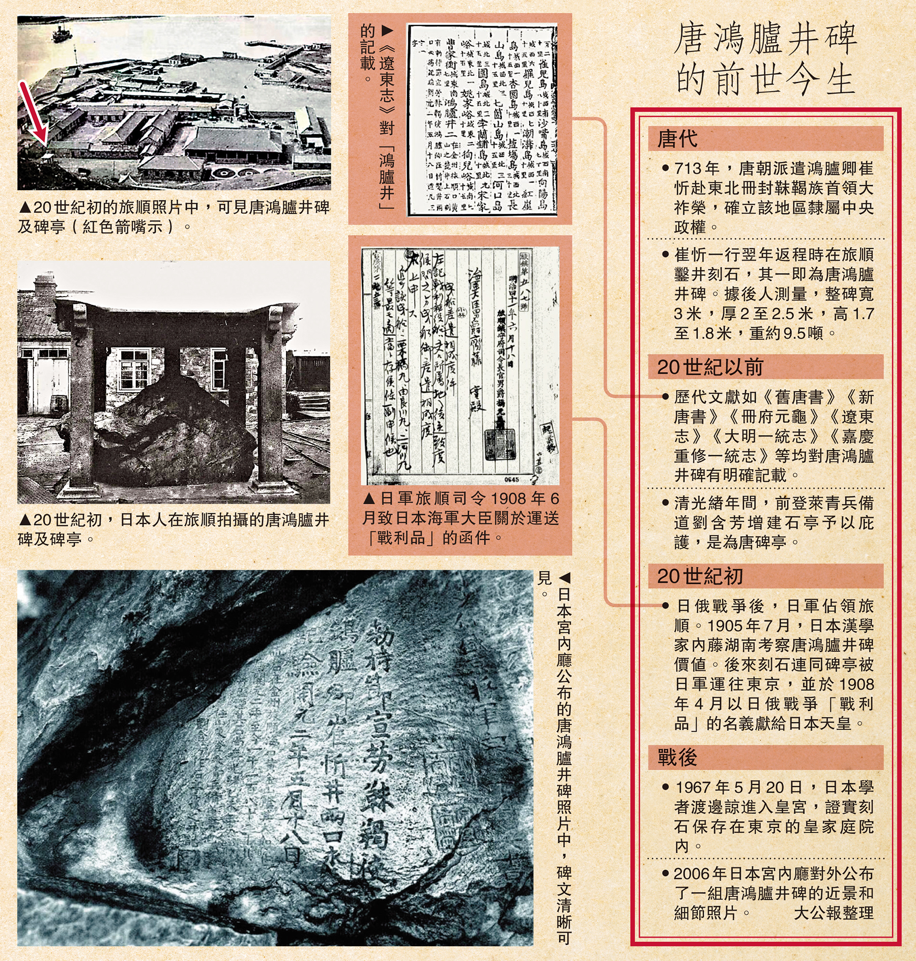 •2006年日本宮內廳對外公布了一組唐鴻臚井碑的近景和細節照片。 大公報整理