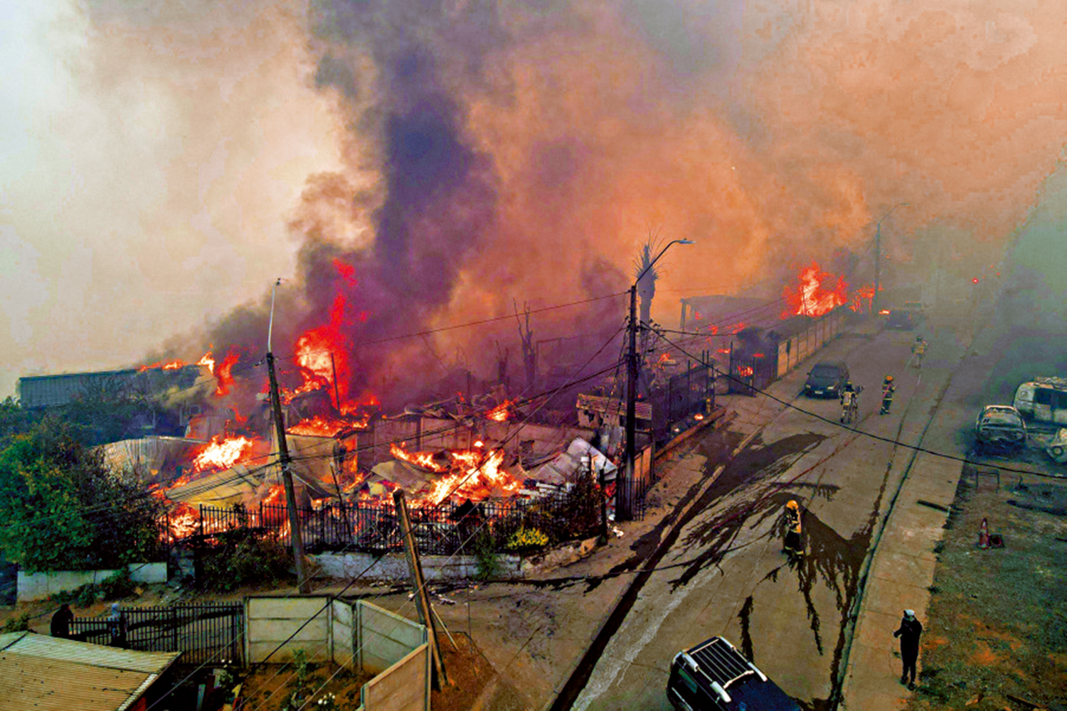 智利國家災害管理局指出,目前超過5萬人被緊急疏散,至少300棟房屋被毀。災後照片顯示,大片市鎮滿目瘡痍,僅剩焦黑的房屋與被燒毀的汽車。