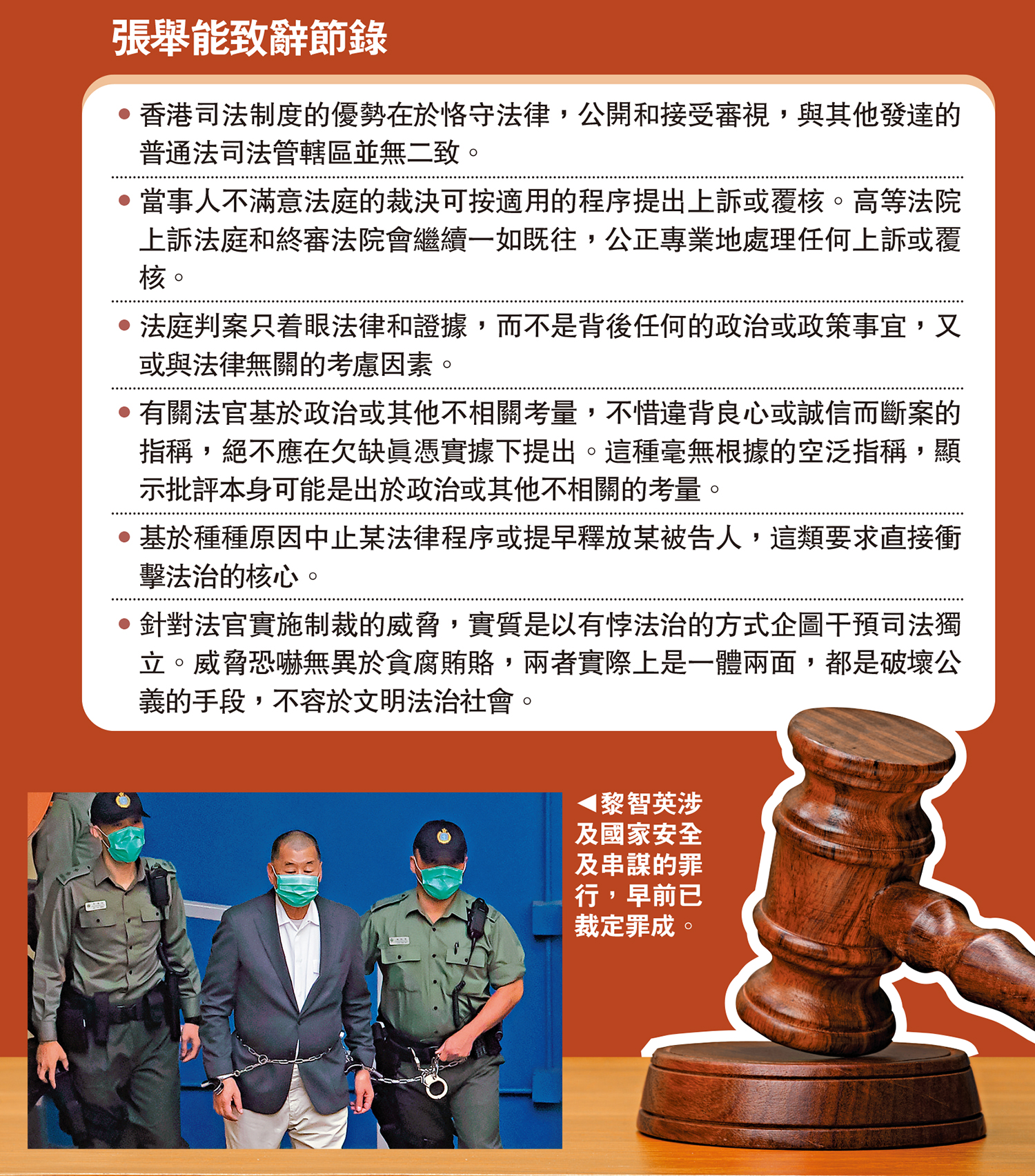 •有關法官基於政治或其他不相關考量,不惜違背良心或誠信而斷案的指稱,絕不應在欠缺真憑實據下提出。這種毫無根據的空泛指稱,顯示批評本身可能是出於政治或其他不相關的考量。