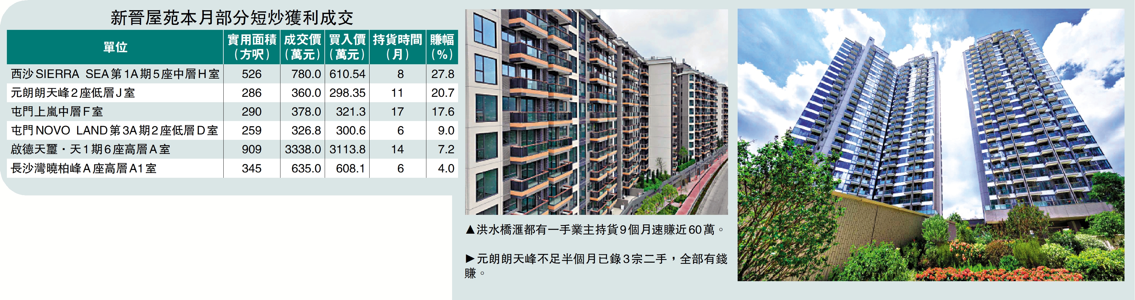 樓市回勇,新盤貨尾相繼削減優惠,帶挈一手業主獲利甚豐,入伙盤頻錄短炒。上月展開收樓的元朗朗天峰已錄3宗二手買賣,全部有錢賺,賺幅最高逾兩成;同屬新晉屋苑的洪水橋滙都及啟德天璽·天亦接連錄得短線獲利個案。業界人士分析,樓市回暖,發展商不欲低市價散貨,陸續以市價推盤,今年樓價升浪勢延續,短線獲利成交比例料持續增加。\大公報記者 林惠芳