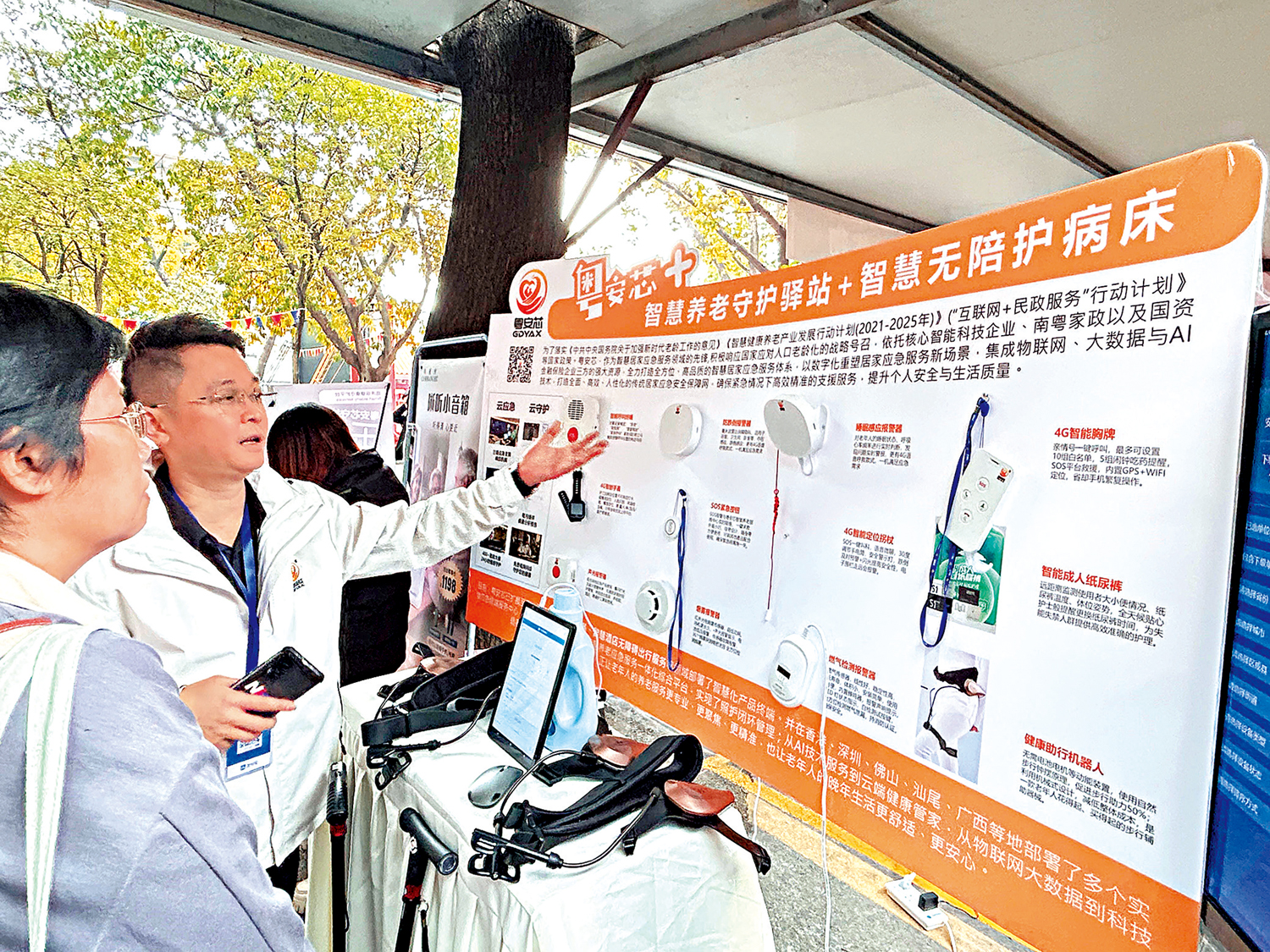語音交互陪伴機器人、下棋機器人、益智五行球、便攜健康檢測手錶……20日,首屆佛山銀齡消費嘉年華活動在佛山舉行,創新科技賦能的智能陪伴產品和服務最受長者歡迎。其中,香港青年梁子斌團隊推出的智慧養老服務平台「粵安芯」整合智慧養老應急、家政、護理、輔具租賃、體檢旅遊等全鏈條服務,簽約服務已超2萬人。\大公報記者 敖敏輝佛山報道