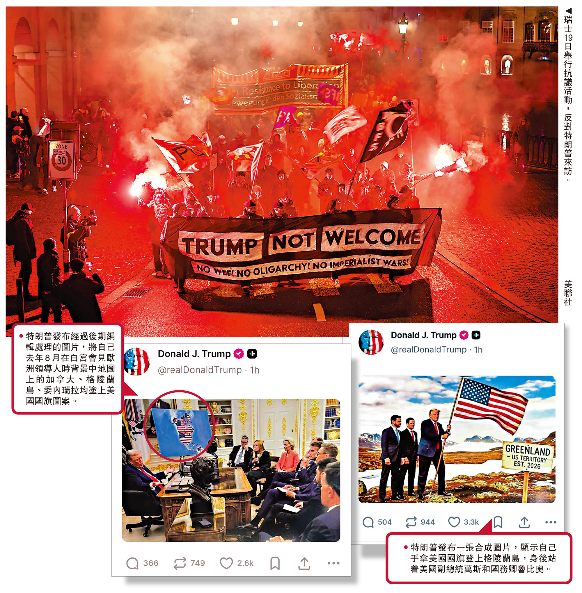 特朗普20日在社媒上發布一張合成圖片,顯示自己手拿美國國旗登上格陵蘭島,身後站着美國副總統萬斯和國務卿魯比奧,旁邊指示牌上寫着「格陵蘭島2026年成為美國領土」。特朗普當天發布另一張經過後期編輯處理的圖片,原圖是去年8月他在白宮會見歐洲領導人,但特朗普將圖片背景中地圖上的加拿大、格陵蘭島和委內瑞拉均塗上美國國旗圖案。