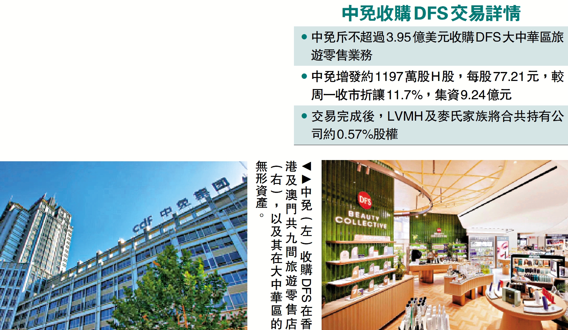 【大公報訊】中國中免(01880)宣布,斥資逾30億元收購免稅店DFS大中華區零售業務,同時透過發行H股作為對價,引入LVMH集團及麥氏家族。消息刺激中免昨日一度炒上12%,最高見97.95元,收市升3.7%至90.65元。