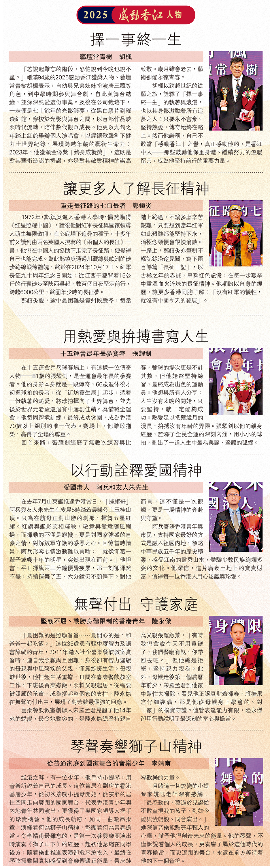 「若說起難忘的階段,恐怕說到今晚也說不盡。」剛滿94歲的2025感動香江獲獎人物、藝壇常青樹胡楓表示,自幼與兄弟姊妹扮演唐三藏等角色,到中學時期參與舞台劇,自此與舞台結緣,並深深熱愛這份事業。及後在公司栽培下,一走便是七十餘年的光影築夢,從黑白膠片到璀璨紅館,穿梭於光影與舞台之間,以百部作品映照時代流轉,陪伴數代觀眾成長。他更以九旬之年踏上紅館舉辦個人演唱會,以鏗鏘歌聲創下健力士世界紀錄,展現跨越年齡的藝術生命力;2023年,他獲頒金像獎「終身成就獎」,這既是對其藝術造詣的禮讚,亦是對其敬業精神的崇高致敬。歲月雖會老去,藝術卻能永葆青春。