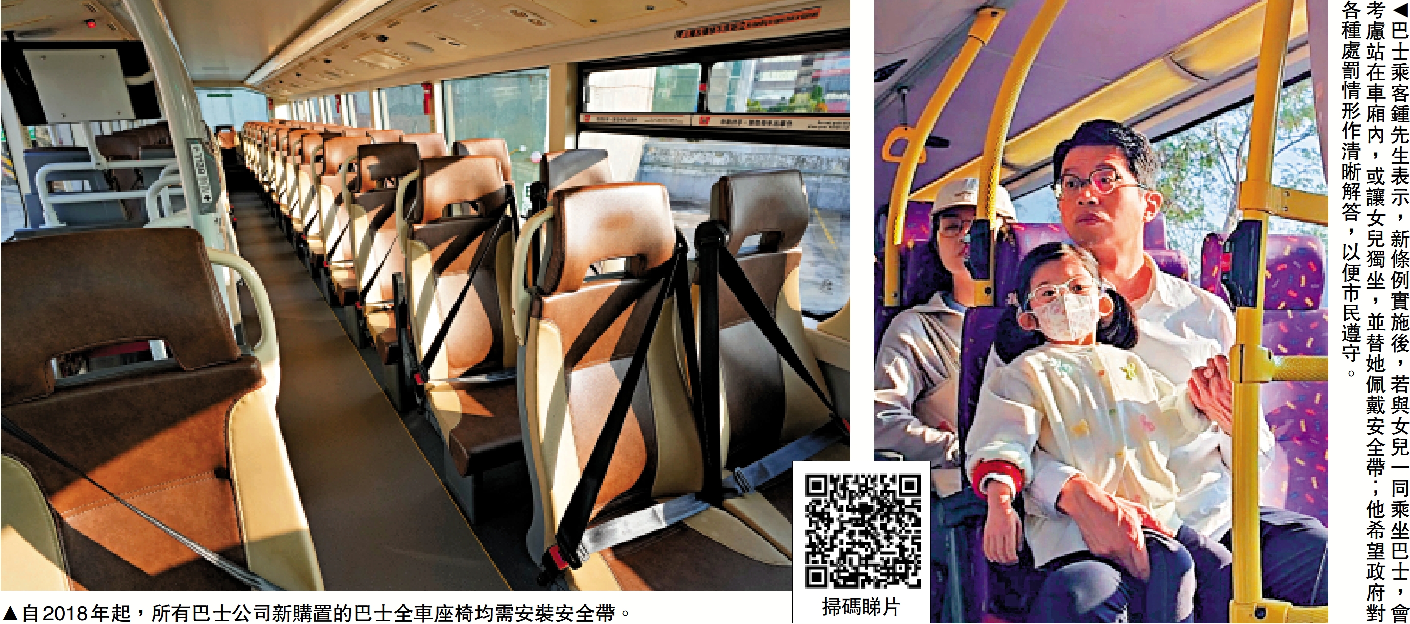 抱着女兒乘坐巴士的鍾先生表示,周末通常帶女兒往茶果嶺公園遊玩,乘坐巴士可直達公園。他說新規實施後,帶女兒外出搭巴士若要扣上安全帶,擔心在特殊情況下解開安全帶照顧女兒時會被處罰。他考慮將來站立搭巴士,或讓女兒獨自坐另一個座位。