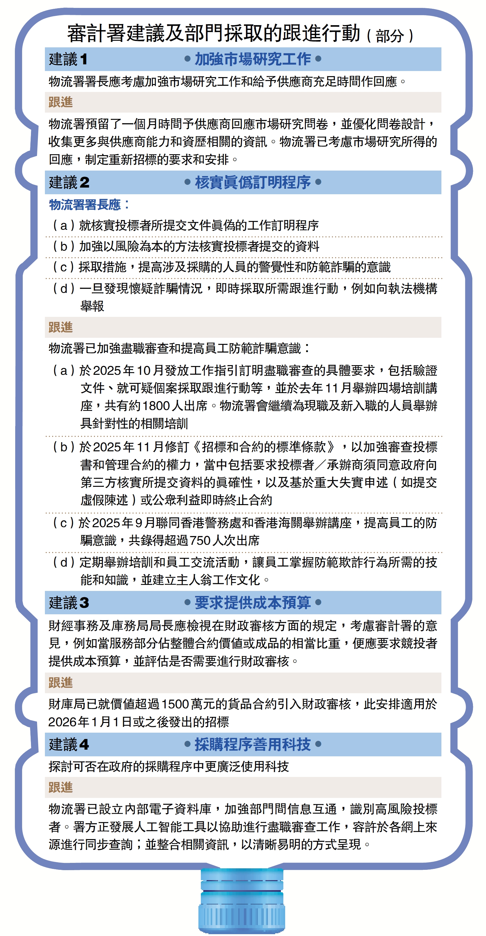 (a)於2025年10月發放工作指引訂明盡職審查的具體要求,包括驗證文件、就可疑個案採取跟進行動等,並於去年11月舉辦四場培訓講座,共有約1800人出席。物流署會繼續為現職及新入職的人員舉辦具針對性的相關培訓